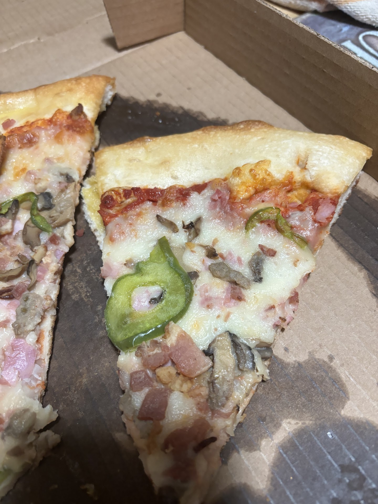Read moreThe very first day i ordered a lg half mushroom ham on the other side doubble cheest that fist pizza omg its was the pizza i loved finally I found a pizza place in Leslie the price was $17.35 the very next day ordered the same exactly the same as yesterday when i picked up my pizza it had burnt crust it looked as it was sitting awhile out didn't have doubble cheese omg and this pizza was$18.74 terrible dam this is why people go out...
