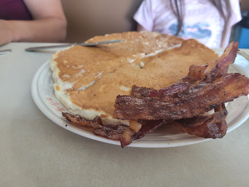 Read moreSimilar to other reviews, I've got to mention that it does take a while for your food. We went on a Monday morning so it wasn't packed, but I did hear that Mondays and Tuesdays there are only two people staffed. So maybe try Wed-Fri if you're worried about wait time? That being said, I think we spent about an hour and a half total. We ordered two pancakes and the 3 egg meal, it took about 35-40min to get to the table. The portions were HUGE, so it's definitely very worth the wait if you're hungry, and the prices can't be beat. We weren't in a rush and the staff was friendly enough, there are definitely regulars that come in too. I think really the only gripe we had were the pancakes, they're massive but they weren't very good. They're very dense and a bit dry, but again if you're looking for a filling meal they're perfect. Overall I'd give this a 3.5 if I could. In terms of cleanliness, the ceiling is questionable, it's a bit run down. But the tables and menus are wiped down after every use and the occupied tables were spaced out. I'm not sure how it would be on a busy weekend though. So, worth it for the bigger portions, but they're not joking...