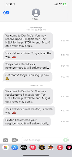 Read moreI ordered Domino's recently and since I live on the 3rd floor of my building, I figured I'd come down and meet the driver so they don't have to walk all the way up to my apartment. I usually do this actually. So I try to meet the delivery driver and ask if that's my order and he says no it's for so and so and proceeds to rush past me. Doesn't check the receipt, nothing. Just completely dismisses me. So I waited for him to walk all the way up to my apartment, see that nobody is there, then come down and admit that it was my order. I don't think I even received an apology. That was very rude. My food was cold on top of that as it took an hour to get to me. Wouldn't be the first time.