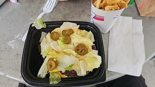 Today I ordered a #4 jalapeno double cheeseburger with no buns and two extra patties. It arrived perfectly cooked and the fries were also spot on. Unfortunately, I didn't know they served unsweetened tea until after I ordered my food, so I got a root beer. I got a tea for my refill though and it was delicious. I will have to remember that for next time.