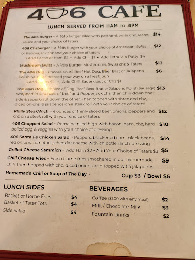 406 is the only place we stopped to eat in Lewistown and I'm so glad we did. Its a little corner spot my son told me about, he went to eat there with his boss. We're from WA state so it was so nice to feel welcomed when we walked inside. The server, I wish I got her name, went above and beyond with us, she was very friendly got us laughing a couple of times. If they had 10 stars I would totally give it just on her attitude. The food was incredible! The fries are to die for, tasted my husband's.. tater tots were perfect, crunchy and just enough seasoning. Prices were worth everything we got, big portions. Next time we go visit we're definitely going to stop there for breakfast and lunch. Unfortunately we didn't get breakfast there, but from what everyone says,...