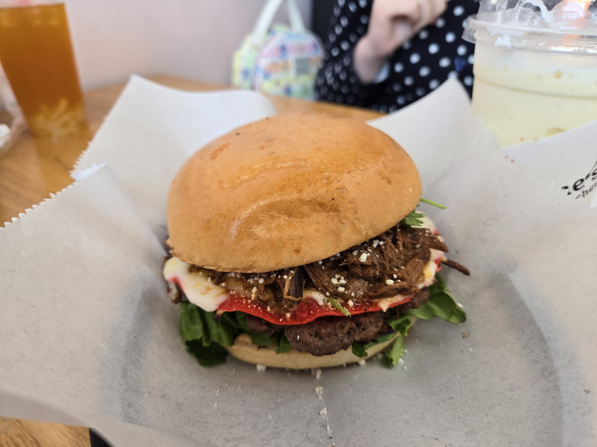 We really mixed it up this time, our first of, Lord willing, many visits. My wife got the K Beef Fries, which was a huge serving of their crispy crinkle fries topped with what can only be described as "Korean chili" and sauce and jalapeños. My daughter shocked us all with her adventurous foray into the Bunrria, which is basically a burger topped with a birria taco. My son, who is sometimes a potato (but in his defense, wasn't feeling well) opted for the normal smash burger, no sauce. I mixed it up a bit and went with the "K" Bae Burger (Korean chili on a smashburger), some "Nash" Fries, and the wife and I split a Kesar Badam -- a pleasant, indian-inspired smoothie. If you've ever had the kheer (rice pudding) and an Indian restaurant, that's the flavor, but creamier without rice chunks. So tasty.