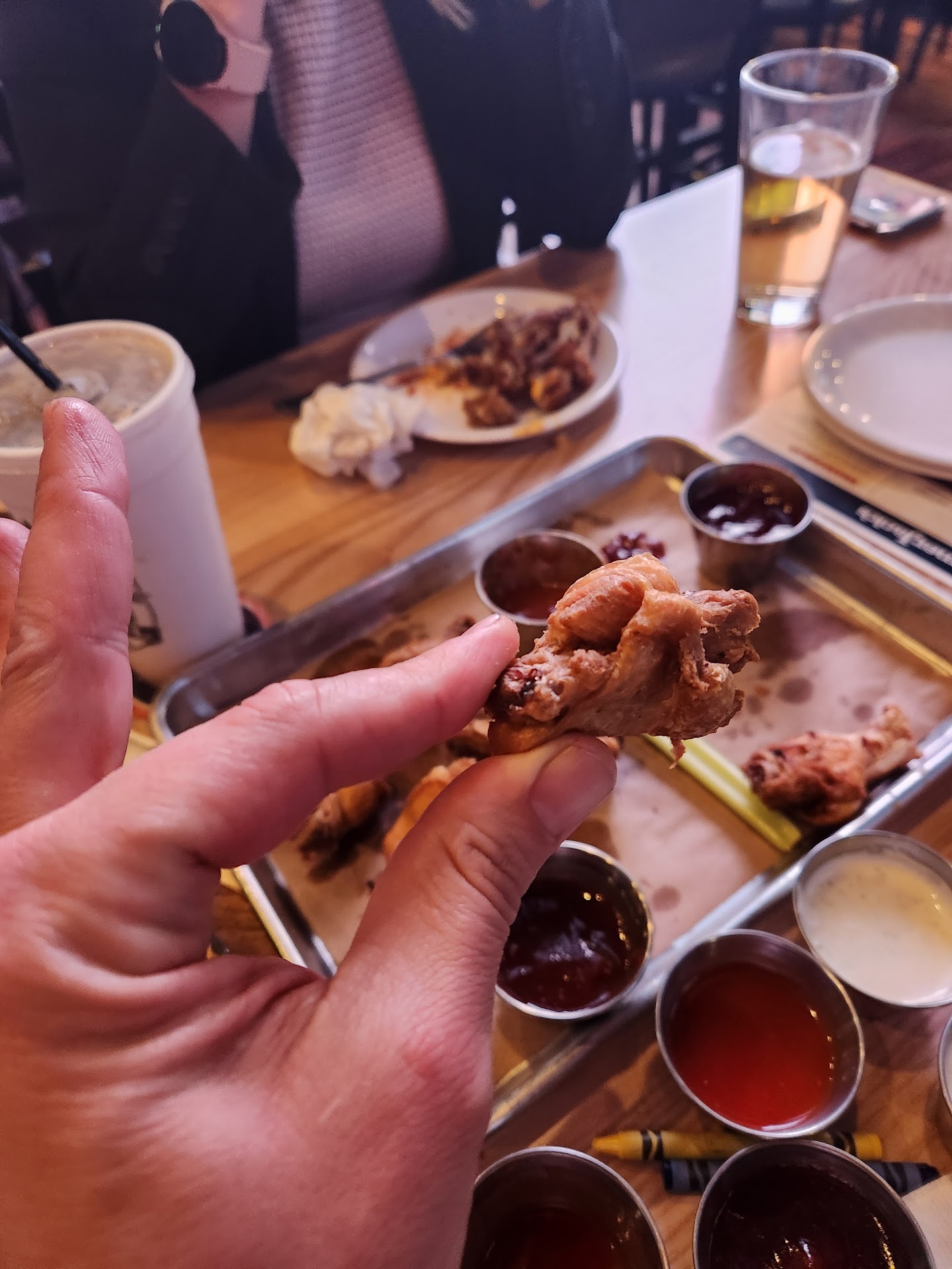 Our order was placed online and consisted of; 2 salads, 40 wings, 2 orders of fries, and 1 Dr. Pepper. The order was to have had 2 ranch dressings per salad, as we paid extra for that, as well as 4 ranch dressings per 20 wings. Again, we paid extra to have additional dressings for our salads and wings both. However, we only received 2 separate medium size containers of ranch, one container was barely half full, the other just a little bit fuller. After using it, sparingly, on our salads there was hardly any left for our wings. I wish I was exaggerating I really do. The fries were in 2 separate containers, 1 was sort of full, one was mostly empty and they were cold and soggy. The wings are different, the bones snapped so easily, like cheaper wing bones do. I don't know if it was a bad order or the vendors changed? But they're different and not very good anymore.