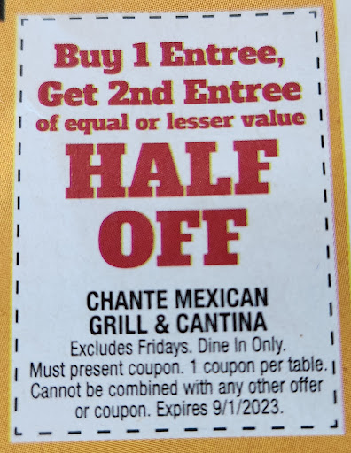 Read moreWe were happy to find a good, authentic, locally owned Mexican restaurant the food is consistently good and the margaritas are great. However, on our last visit, we realized customer service means nothing to them. We cane across a "buy one entree, get one half off" coupon in a local mailer, so we decided to stop in for lunch while running errands on a Saturday. When our waiter csme to get our drink order, I showed him the coupon and he said it was good, but to give it to him when we paid for our meal. When he brought our check, my husband gave him the coupon and a credit card. The waiter cane back saying the coupon wasn't good on Saturday. I pointed out The coupon clearly stated it wasn't valid on Friday, not Saturday. He said he had been told not to accept it, at which point I asked to speak to a manager. Instead, a waitress came and rudely told us the coupon wasn't good on the weekend. I asked why when it clearly said it wasn't good on Friday. She said that meant it wasn't good all weekend. Again, I asked to speak to the manager and was told he wasn't there and they didn't know when he would be back and she was in charge. With nothing left to do, we paid the full price check. While we have been to Chante several times in the last few months, but we won't be back. I'm all for supporting small restuarants, but not when they are deceitful and refuse to honor ...