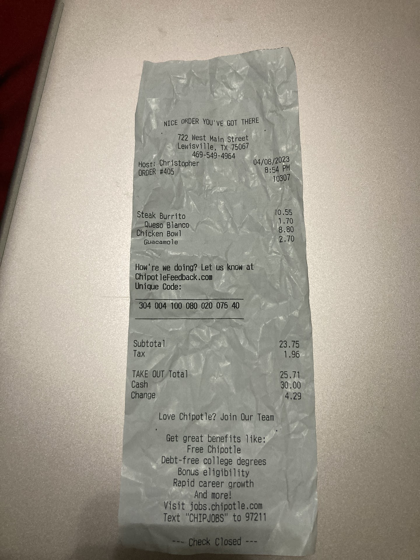 donât come here if you are looking for a good wrapped burrito. this old man there (not trying to be rude) was trying to roll my burrito but doesnât even know how to spread both tortillas out so once he does roll EVERYTHING falls out once u open the foil. i asked them like 7 times to use a new tortilla because they tried 3 times unwrapping and wrapping the burrito again. none of them listened especially the cashier with the attitude. after like 5 minutes waiting on the side i finally got my burrito again but didnât see if they rolled it right. i went over to seats and checked. what happened? the whole burrito fell apart. i told them âplease re do this. any sane person would know this is not rolled right. what did they do âsorry we have a line and youâve annoyed us enoughâ okay so now iâm in fault for wanting a well wrapped burrito so i can eat without it falling apart. so i said âjust give me 2 tortillas on the side iâll roll it myselfâ so i get the tortillas and surprise surprise. theyâve rolled it in foil so bad that once u open it the tortillas have holes in them and tears on the side. thatâs not all btw. so i get in my friends car and we drive away from the store. i pick up my bag and what do i see? a bunch of queso and salsa water dripping out from the bag. EVERYTHING FELL APART ON THE WAY HOME. NOT EVEN 5 MINUTES! do i want a refund? NO. i wont even accept free food from here because they DONT KNOW HOW TO MAKE IT. i can keep going? okay iâll keep going. so i moved some of the stuff from one burrito to a new tortilla the best i could, my first bite: bad chicken. i keep eating itâs fine. the last few bites had A LOT OF BAD chicken that was NOT COOKED. i woke up this morning not even an hour ago with the worst stomach pain and have not ate anything other than that chipotle & breakfast yesterday. this is the 4th chipotle iâve gone to in lewisville, grapevine & flour mound. none of them have had me say âthis is good foodâ without struggling to eat the food or it falling apart. PLEASE teach these managers to do their job and teach these employees how to do...