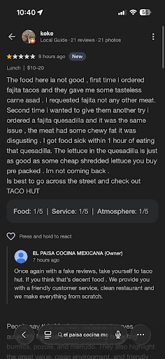 Im not sure why you âownerâ is trying to be problematic about my review . Just own it and train your staff better. The issue was not only lettuce, it was the MEAT. Thats not what i wanted. I was on my lunch break and i only come to find out that you guys served me something i didnt order. It was take out. In addition that it happened TWO times. First time that i ordered tacos wrong meat and the second and LAST again the wrong meat .
