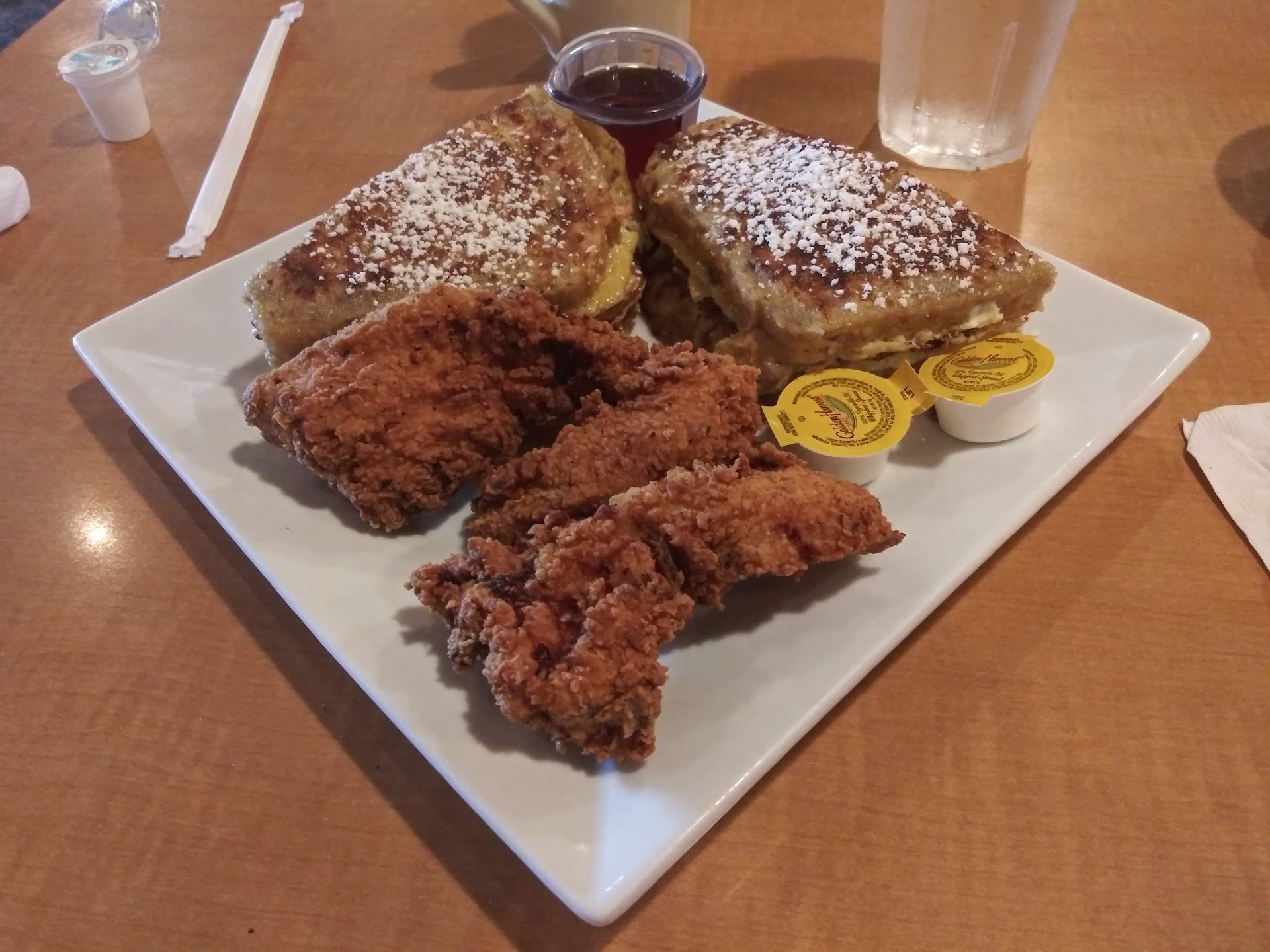 I was torn between Chicken & Waffles and Stuffed French Toast. So I ordered the Stuffed French Toast and substituted chicken tenders for bacon/sausage. Coffee to drink.
