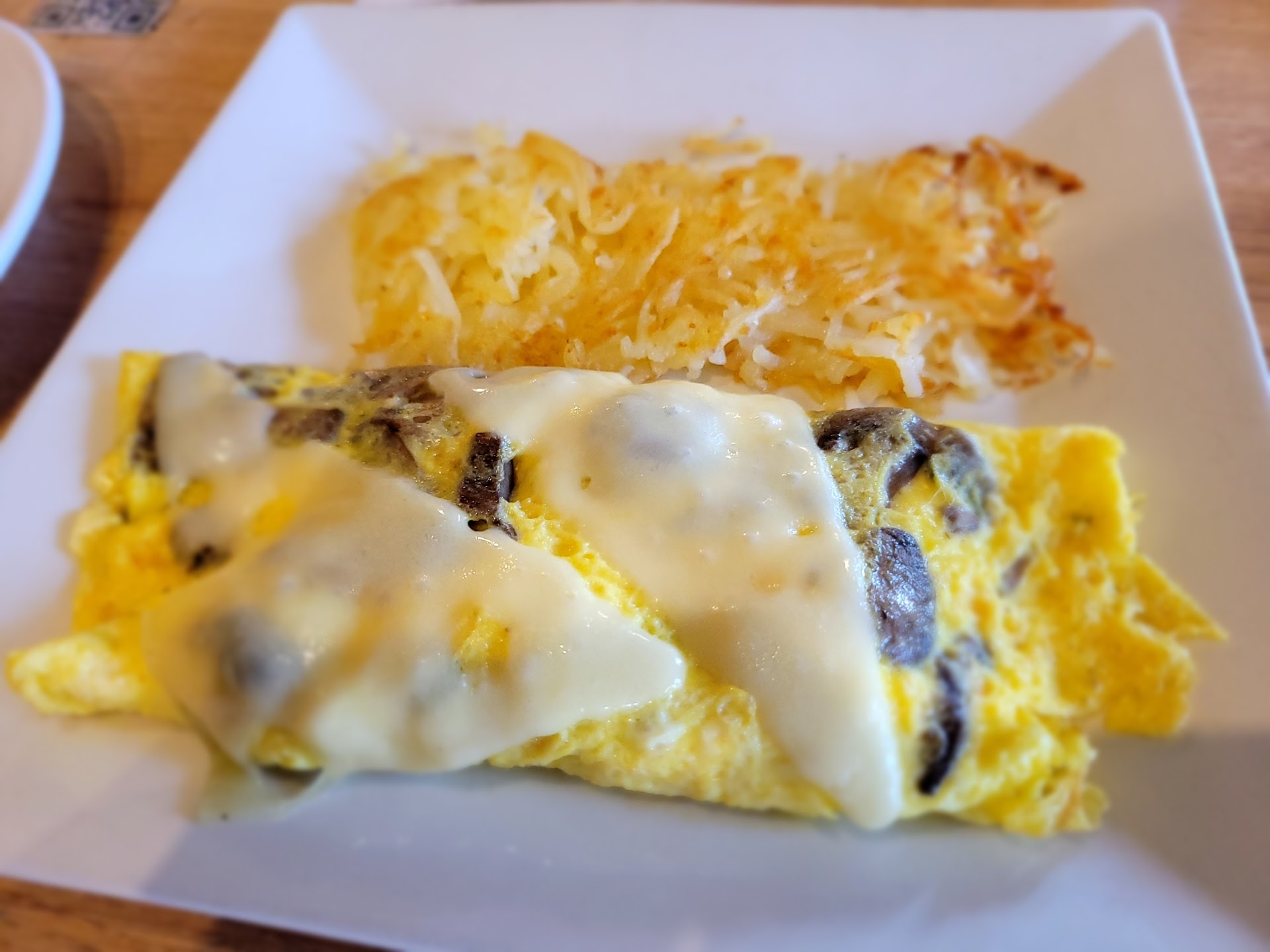During my visit, I ordered their swiss omelet, which consisted of perfectly cooked eggs, sauteed mushrooms and swiss cheese with a side of golden hash browns, and biscuit with gravy. Each component of the platter was cooked to perfection, highlighting the skill and attention to detail of the kitchen staff. The portion size was generous, leaving me fully satisfied and ready to tackle the day ahead.