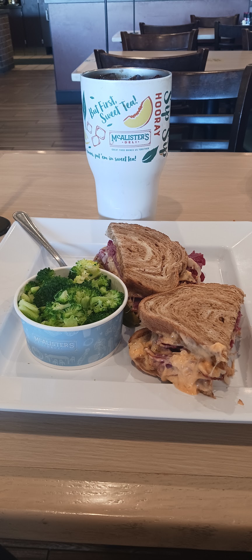 We get to the counter and order our food. The counter is full of sticky drinks from the bottom of cups throughout the day; this was easily seen in the light. Not sure how none of the workers noticed. It seemed like all the staff was leaving because the three people with McAllister shirts gathered their things and made eye contact before walking out the door.