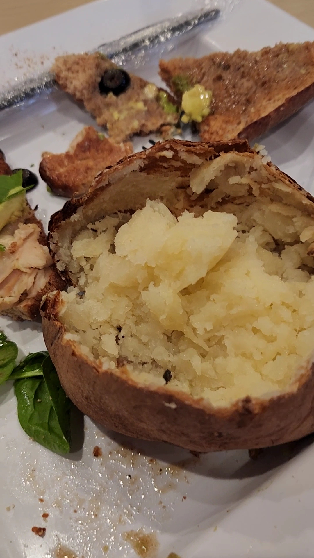 The cashier goes to the back to help the chef as it seems she and another guy now speaking with the chikfila men are the only folks there. I’m guessing he’s a manager as he never went to the kitchen to help her. I went up for ranch and the ramekin they gave me had food on it. I didn’t make a fuss as I put it to the side and waited again for our food. Immediately, I noticed red sauce or juice all over my plate! It’s on the sides of my plate, under my soup cup and near my potato, all dried up like it had been there for a while. How did they not see this on the walk from the kitchen to my table?!
