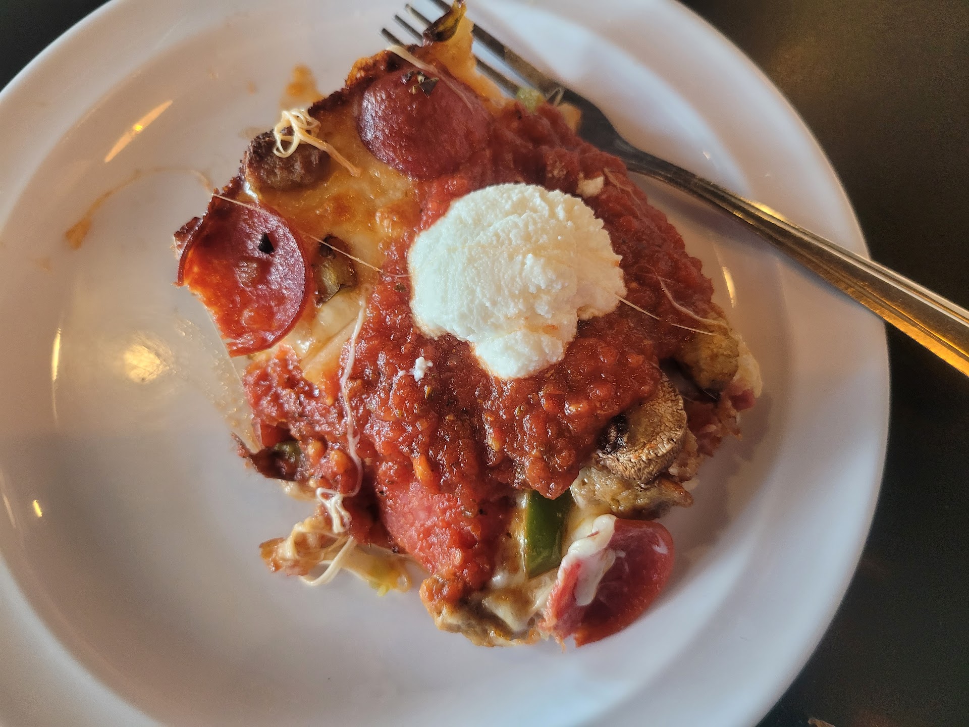 I killed the salad, and then the pizza came out. It was hot, and the bottom was nice and toasty crunchy. The pizza flavor was very good and had a dollop of ricotta cheese on every square. I really enjoyed the pizza, but it was just kinda of pricey. The pizza is in a rectangle shape, and I believe the large had 8 squares. Crust was good and buttery. The flavor was on point. I ate a couple of slices because I was full from the salad I took the rest to go for later.