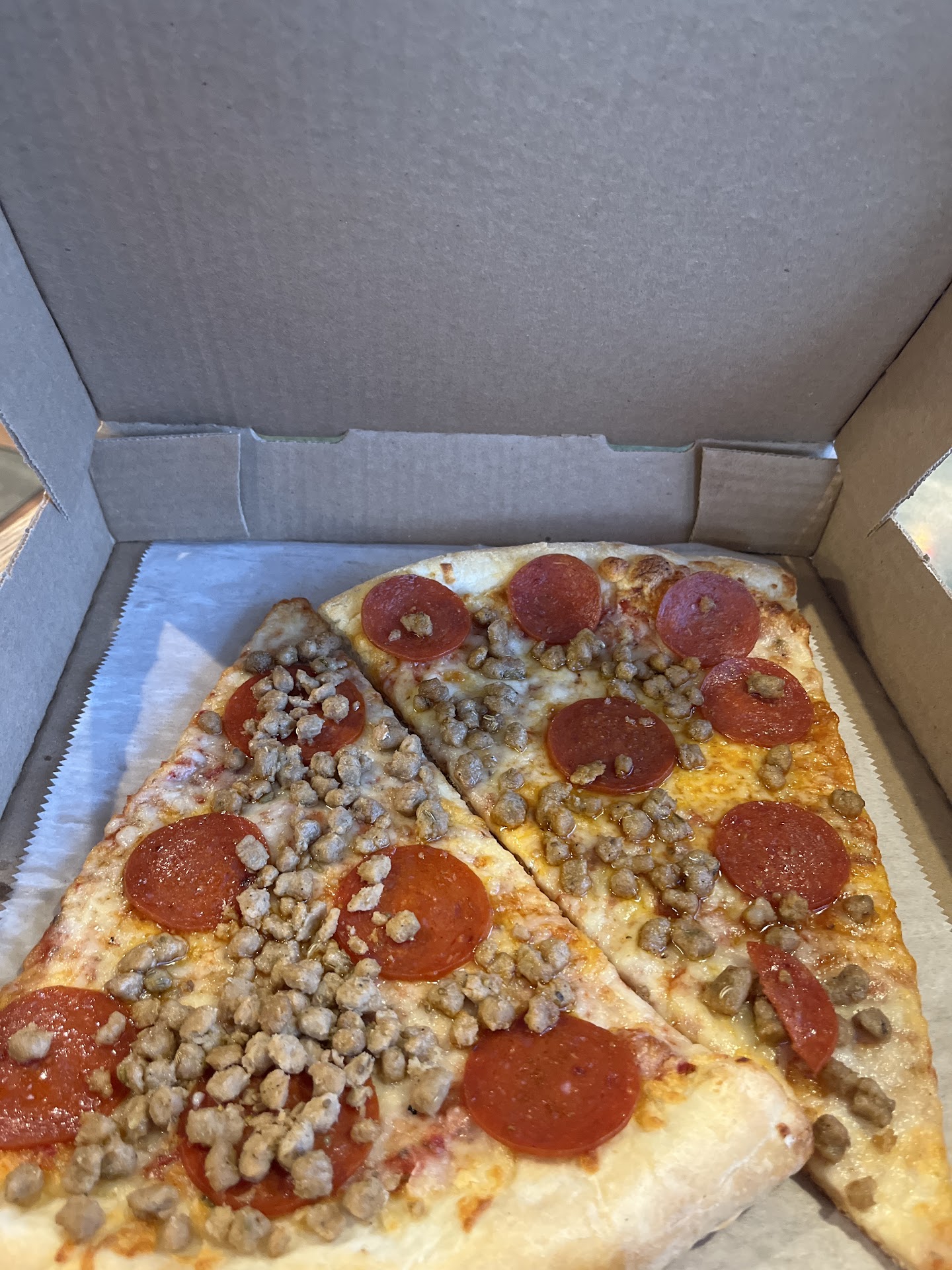 Pizza #1 plain cheese, was actually ok. It's hard to tell why the crust was so dense and gummy. It's possible this restaurant is so busy and popular they just can't keep the oven hot enough and it didn't cook right, or if it suffered because of the hour long sit in the driver's car.