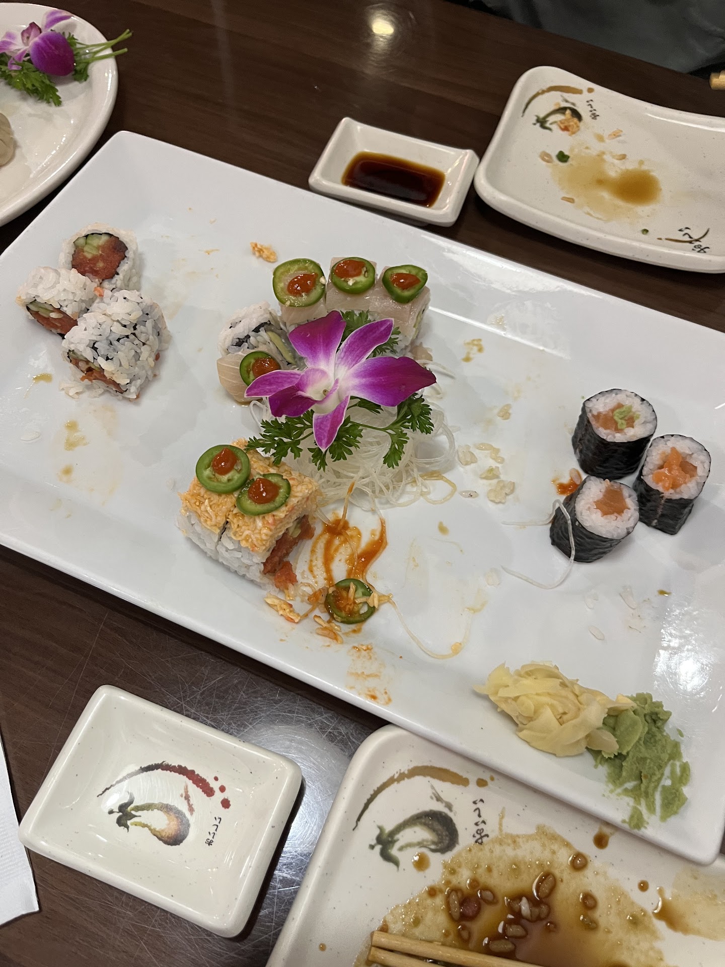 The food was okay, but there are many better sushi restaurants in the area. The miso soup we had was good, but the sushi itself was definetly subpar. I ordered a crunch roll, which comes with little bits of tempura on top, and they were overly greasy and stale. The salmon and hamachi nigiri I had were bland and flavorless, and the tamago (egg) nigiri was borderline inedible. It had the texture of chewed-up cardboard, and was just as bland as the fish. I was disappointed, as tamago nigiri is my favorite kind of sushi and I usually save it for last, so my meal ended on a bad note.
