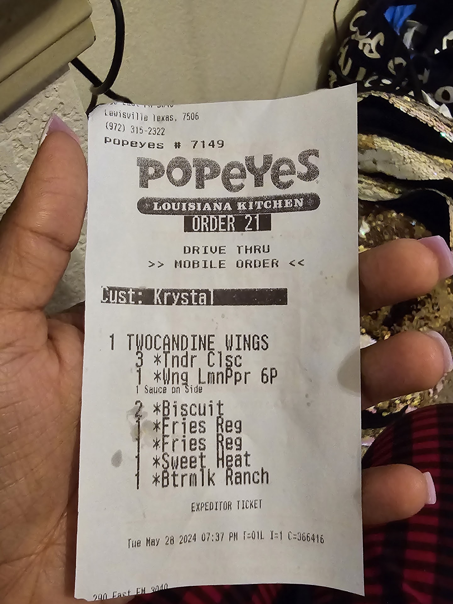 Read morePissed off. This is my first time using the popeyes mobile app and my first time ordering at this location and everything was wrong. First my husband was picking up the food on his way from work so I placed the order right before he got there. When he gets there I'm on the phone with him making sure he has no problem getting the food and I hear him say loud and clear "here to pick up an order for krystal" me not knowing that the lady or whoever was working the window made him pay for a senior discount order that WE DID NOT ORDER AND HAD ALREADY PAID FOR MY ORDER THRU THE MOBILE APP!!!! She handed him 2 bags after he paid so he wasn't aware that he was paying for an order that wasn't ours and I didn't think I had to tell him that the order was already paid for considering he had just told them HE WAS PICKING UP AN ORDER!!!! BESIDES THAT THE FRIES STRAIGHT TRASH 🗑 😡🤬🤬🤬 AND FULL OF GREASE I SQUEEZED THE FRIES AND NOTHING BUT GREASE NOT HOT OR NOTHING JUST LIMP, GREASE COLOR BROWN FRIES, AND GREASE JUST FULL OF GREASE!!! ALSO I ASKED FOR THE HONEY LEMON PEPPER WING SAUCE FOR MY WINGS, DIDN'T GET THAT EITHER. AND KNOWING THESE BISCUITS ARE ALREADY LOW KEY DRY WE DIDN'T GET ANY HONEY PACKS FOR THE BISCUITS....IT'S SAFE TO SAY I WILL NOT ORDER FROM THIS LOCATION AGAIN.....I'M BEYOND PISS BECAUSE I CAN'T ENJOY THE FOOD THAT I 🤬😡 PAID FOR UGHHHHHHHHH!!!!!!!!🤬🤬🤬🤬🤬🤬🤬🤬🤬🤬🤬🤬😡😡😡😡😡😡Also tried to call 3 times no answer or...