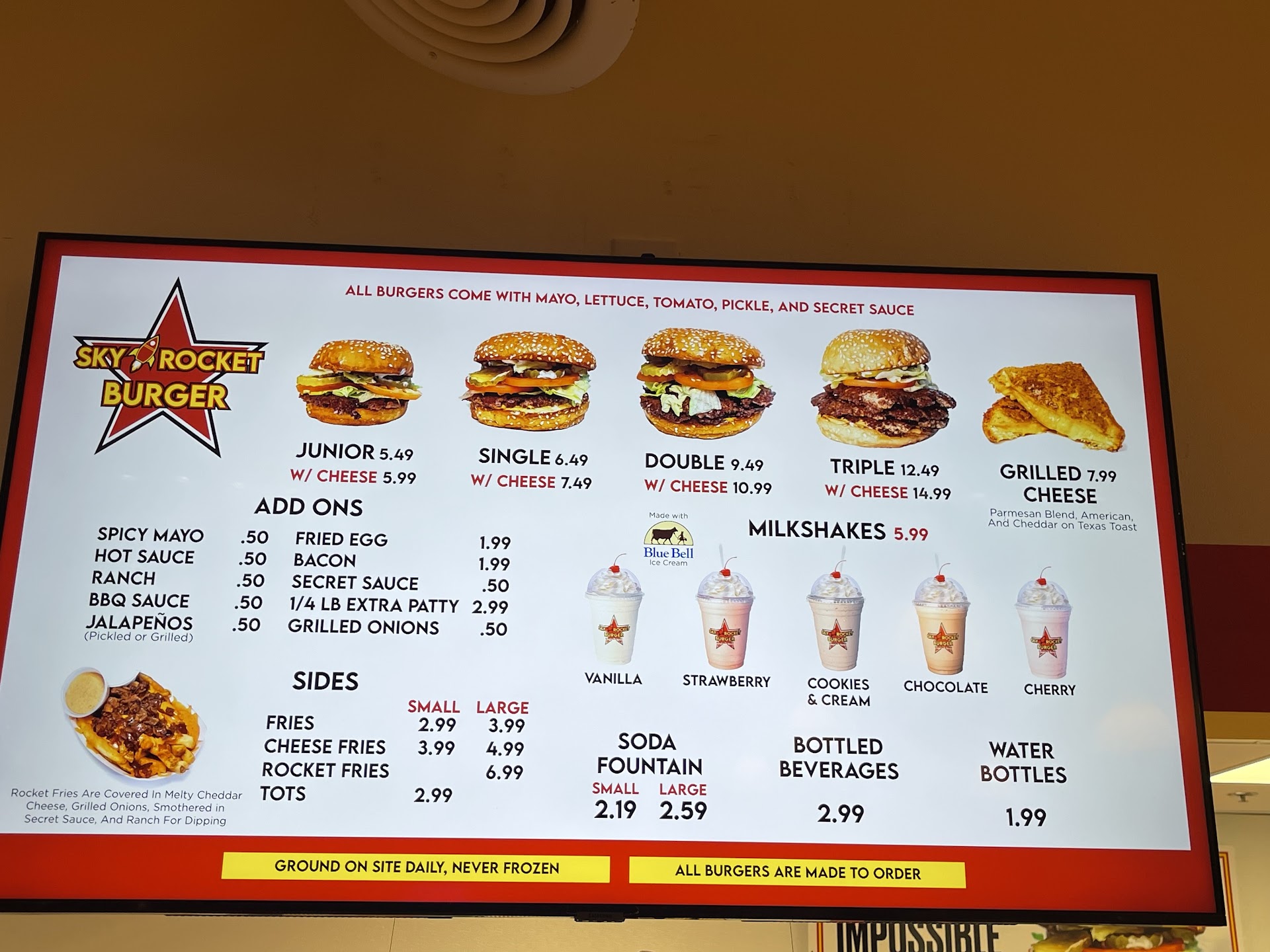 My son-in-law is faithful to the Sky Rocket. It was a 15-mile drive, but it can take 20-30 mins at the wrong time of day- no biggie. I went all in. The Lewisville location is no dine-in experience- tables and chairs and a smallish space but clean, and it works. It’s not an old-school hole in the wall but a new, fresh one! The double cheeseburger was fresh, and the meaty flavor stood out. The focus is on the meat, not the cheese, which I prefer more cheese, or the sauce, which I like plenty of—I loved the sesame seed bun, which is very fresh and durable. I would say the burger isn’t Huge, But at $10 today, that’s what you get for freshly made. The chocolate shake was good again; it was not huge, and it was not earth-shattering. It worked. His fries are thicker, plentiful, and hot, hot, hot. Cause they are fresh. The rocket fries were delicious as well, but a bit spicy. They are smothered in cheese, onions, and secret sauce. I think the secret sauce has cayenne pepper. I didn’t taste any spicy in my burger, though it has secret sauce. I think burger fans need to try this spot—others will think it’s a good burger. Some will come back with cravings. All credit for original pour yourself fou rain colas too- some love it.3 of us and a toddler who knocked back a 1/4 pound patty only, was about $60 with tip.3 doubles, 1 large fry, 1 rocket fry, 2 drinks...