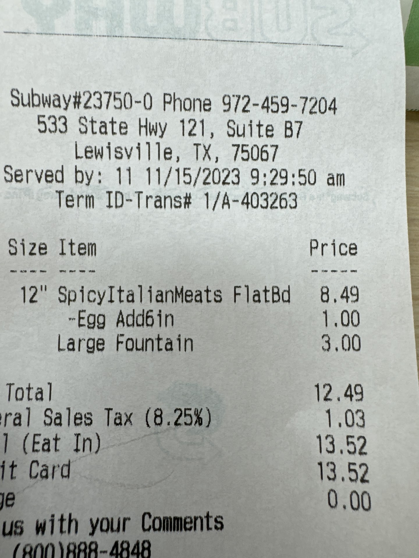 Read moreThey charged me for my meal, and then told me that it didn't go through even though the card reader said transaction approved. I checked my banking app and showed them the charge went through. They would not acknowledge that I paid and wanted me to pay again. I left the food, and just got off of the phone with my bank who said the charge did go through, and now I am having to file a claim to get my money back. Legitimately the worst experience I've ever had at a Subway. I wish I could give them...