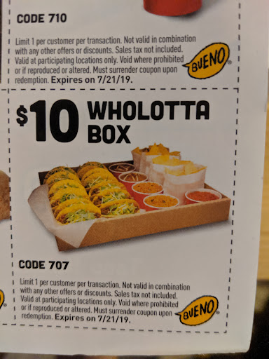 Read moreThis is one of the only Taco Buenos in the metroplex that still has good tasting food. Not only was it hot and fresh but the beans tasted so good. Most of the other Taco buenos don't know how to cook beans anymore and everything tastes weird or bland or sour like it has been out all day. But this one is delicious,slightly greasy(that's what makes it taste good)and very yummy. I'm happy because since I was an assistant manager at a Taco Bueno in the 90s I know how it used to taste, it used to be much better than now. But this particular Taco Bueno still makes good food just like we did in the 90s. It's worth the extra...
