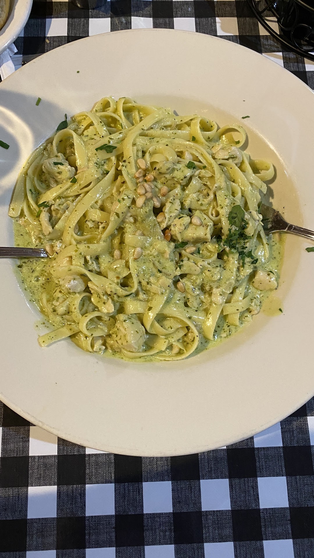 The pasta dish was excellent. The sauce was a nice thickness and had a slight brandy taste. The sprimp were large and well cooked, and the crab meat was definitely identifiable and tasty. I was very pleased with my dish and thought it was a fair value for the price. My wife had Al Pesto Genovese which she enjoy very much. She thought that this was going to be more of a pesto instead of a pesto cream sauce, but she ate the whole plate.