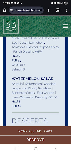 Hate writing bad reviews but.. Went to 33 staves yesterday for mothers day. Had a reservation at 7:30, it wasn't busy at all, get there and takes about 5 min to get seated. Took another 30 minutes for the woman to come take our order and tells us sorry it's just her and the bartender working and that she's the supervisor can you belive us moms have to work on mothers day, i havn't served in a long time so bear with me, let me go get my notepad to write down your order. She comes back and says I'm so sorry I forgot my notepad let me go grab it. Comes back again and said she had forgotten it again! She finally comes back with it to write our order down and 1 cocktail my gf ordered. Took about 30-40 min to get the drink (which was not good at all) and another 30 to get our food. We asked for 1 more set of silverware as the 5th person in our table didn't have one. She never came back so he walked over and grabbed one where they are placed. We start eating and the food was just horrible đ©. As we are eating She comes and say oh here's that silverware, we said we don't need it now, she lays it down on the table and says well here you go anyway. We tried to eat what we could and waited forever for her to bring our check so we can get the hell out of there after being there so long. It was our first time there and will be the last. Today my gf and I has upset stomachs. Such a horrible mothers day dinner. As a supervisor, you should know every in and out of that place and...