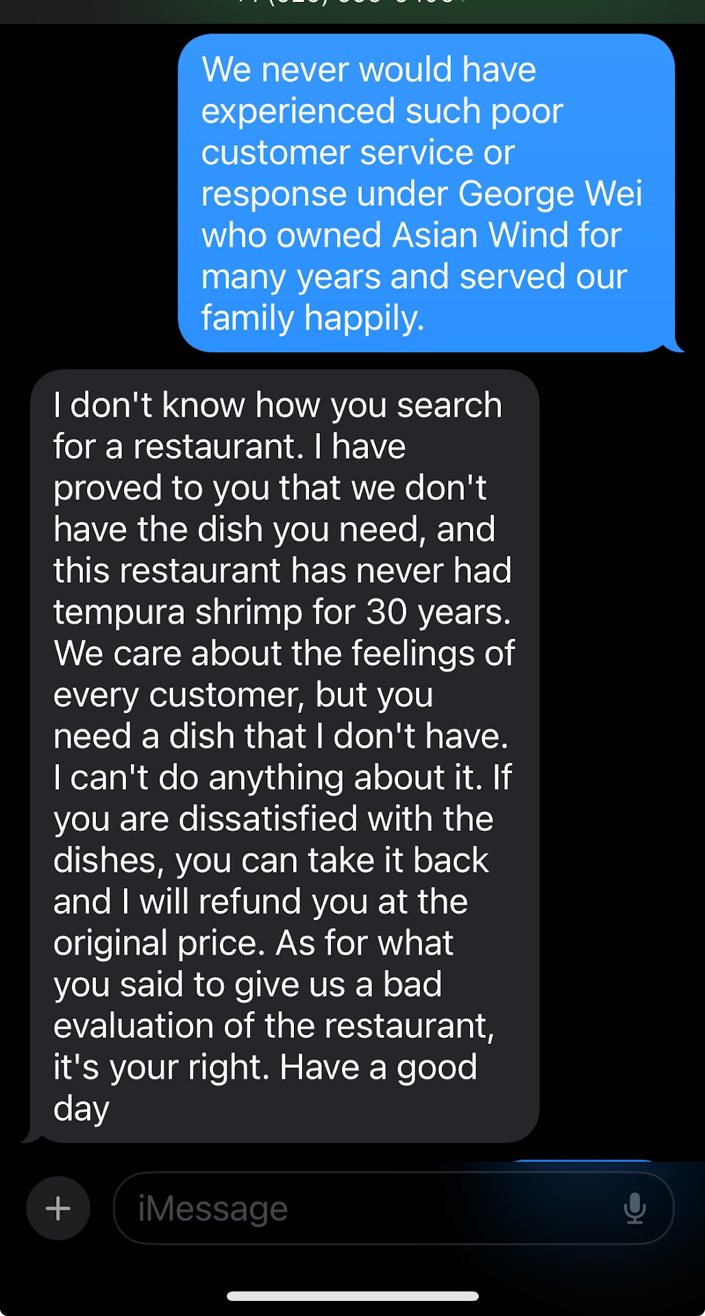 Goodbye Asian Wind. May you survive your current owner. TO THE OWNER per his reply below: Despite your comments that you aim to resolve any issue, you have my phone number and have done NOTHING to resolve the experience except to offer us the chance to return our food 2 HOURS later for a refund. You have MUCH to learn about proper...