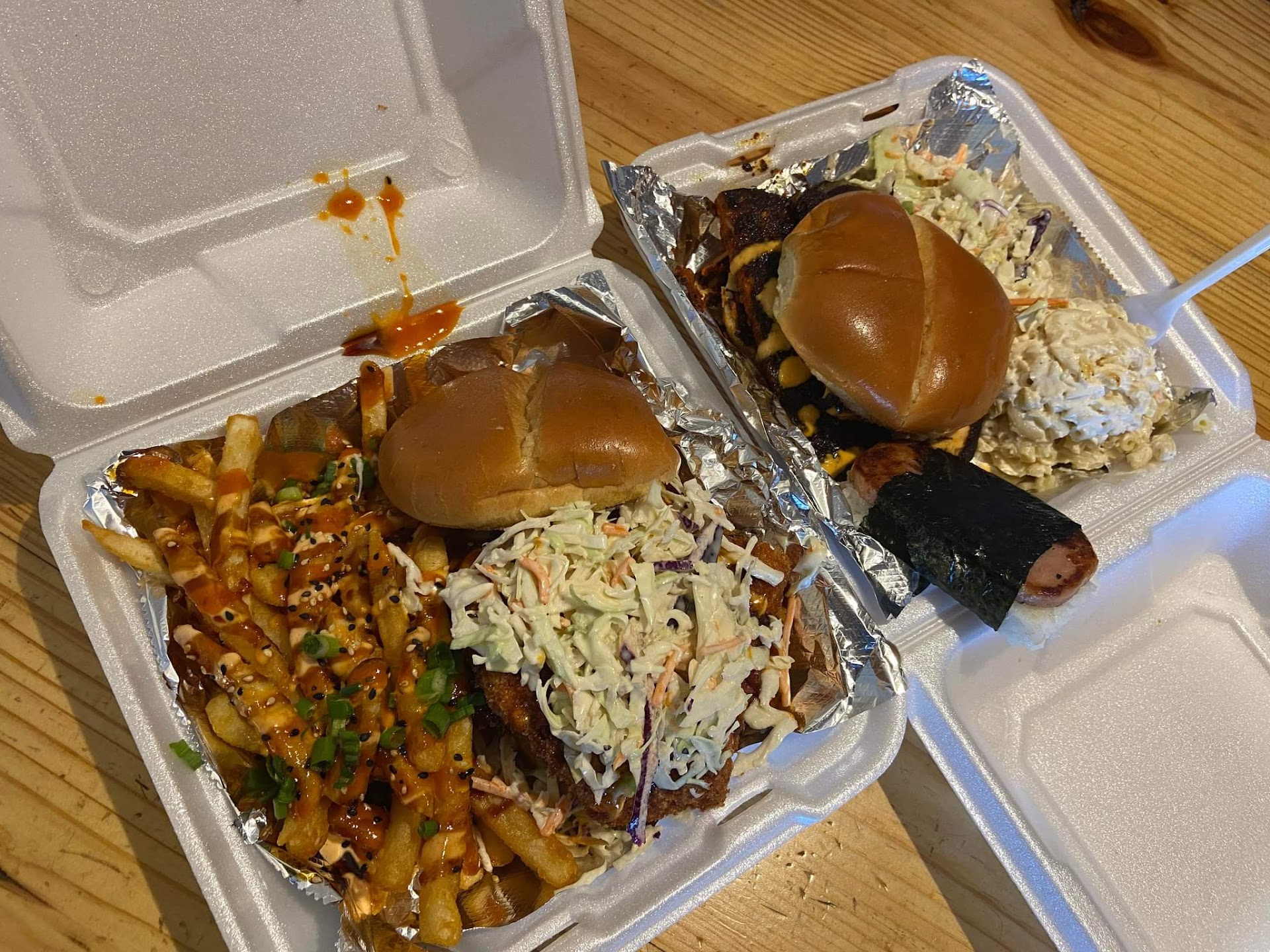 I tried the Katsu Sandwich with panko fried pork, eel sauce, spicy mayo, cabbage slaw on a toasted bun with sticky rice. The sandwich comes with two “patties” and they were fried to perfection. The spicy Mayo and eel sauce played well off each other, adding a spicy sweet punch. The slaw had a nice creamy slightly sweet crunch that cut through the saltiness of the pork, and it was served on a nicely toasted sweet Hawaiian bun. The sandwich was huge and messy and just absolutely great. The sticky rice was cooked perfectly as well. It was topped with spicy Mayo, house chili sauce and sesame seeds. The entire dish is excellent.
