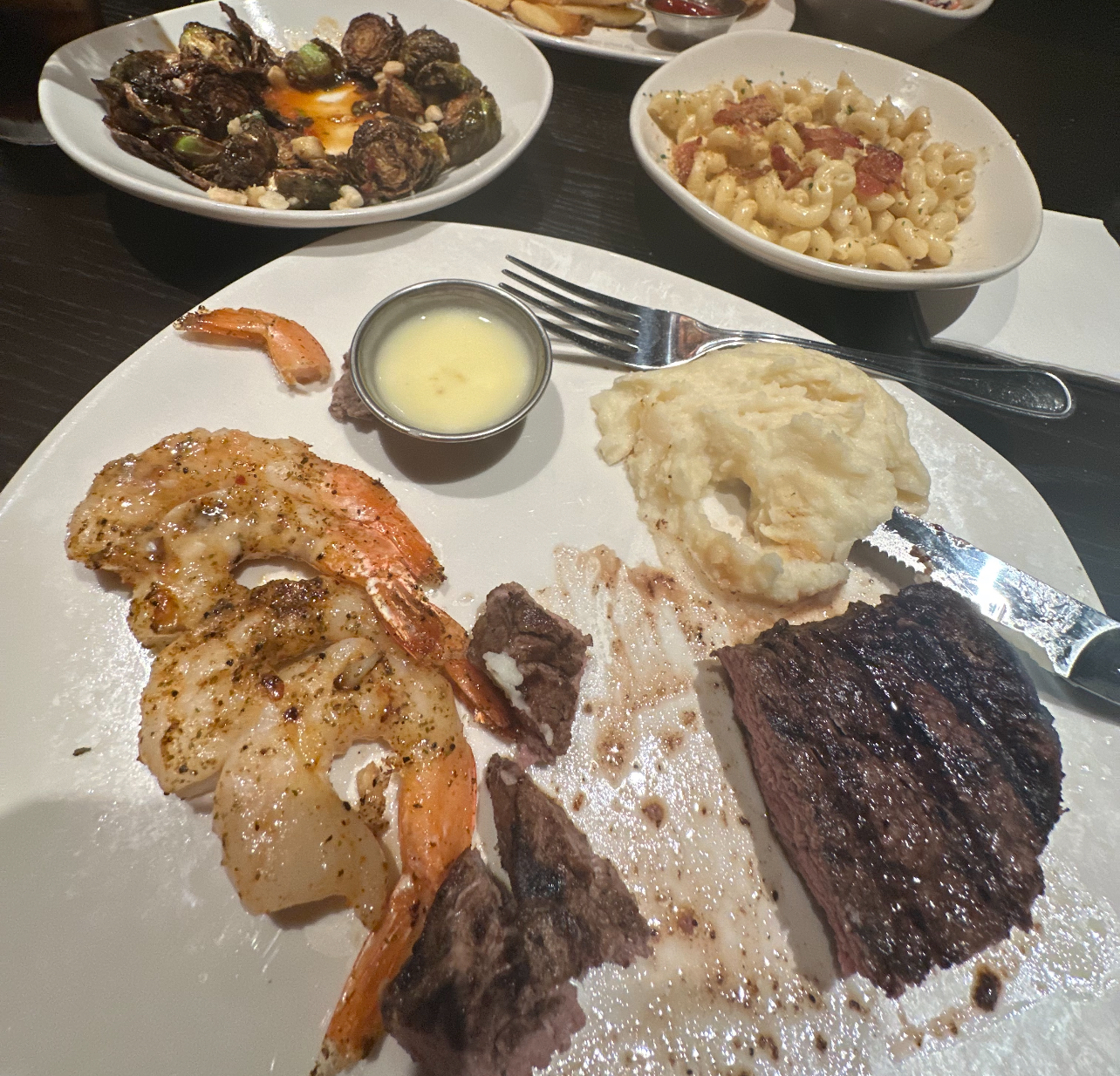 I had the crab cake and sirloin steak with the risotto, which is an upgraded side, and the whipped potatoes. I wasn't wild about the risotto, specifically the basil oil on it. normally. I love basil so that was surprising to me. My friend had the shaved brussel sprouts salad with the salmon fillet and loved it. The desserts were not very good. I had the drunken coconut pie and it just tasted gritty. The "drunken" part was an overly sweet syrup that was fortunately on the side of the plate so I could avoid it almost entirely. The key lime cake that my fiance had was a pretty big portion but was very dry. It would have been nice if the server had come back to refill drinks but that didn't happen the entire time we were there.
