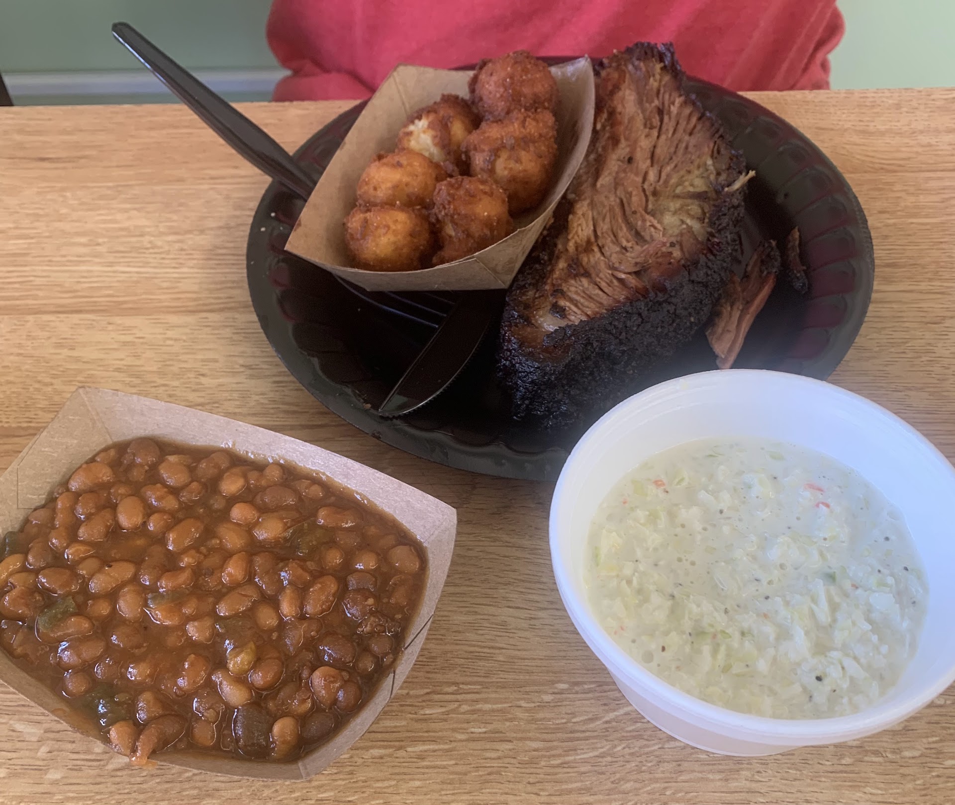 Read moreFirst time at Bridgett's and it was a nice surprise! We went at lunch time and all the tables were either full of folks or dirty dishes (people having recently left). It's a busy little place! We were told to pick a table and we moved the previous guests leftovers to another table. It took a few minutes to get service, but they were busy. The restaurant is located in sort of a strip type area and there is parking, but it's tight at busy times. The restaurant is kinda laid back with a light and airy country feel. You can SMELL the bbq as soon as you get out of the car! Service: Our waitress was AMAZING!!!, helping us through the menu. She was knowledgeable about the menu and helped us figure out what we might like since it was our first time there - and took the time to do so even though they were exceptionally busy. If you want the smoked chicken (like I did after looking at their online menu - which is pretty much accurate - SCORE!!), you can only get this on Friday. The rest of the week it's pulled chicken. Food: I ordered the half rack of dry ribs with roasted potatoes and green beans. My friend ordered the hamburger steak with green beans and hush puppies. My ribs were a little on the spicy/hot side, dry like they advertised but had sweet, home style and spicy bbq sauces on the table. I really enjoyed the sweet bbq table sauce with the ribs, as it took some of the edge off of the (to me) spicy/hot ribs. The green beans were awesome. And the roasted potatoes were great... So much so that my friend said, "If the potatoes are this good, I wonder what their collard greens taste like?" I mentioned this to the waitress and she brought out a small sample cup of greens and OMG! I wish I had ordered the greens! They were divine! Seasoned to perfection! Can't say enough about them! The hamburger steak was ok - a little on the 'done' side and the hush puppies were delicious... No onion flavor and a little on the sweet side if you're into that. Overall, we had a great experience and will probably go back again. Prices are good for the amount of food provided and the service...