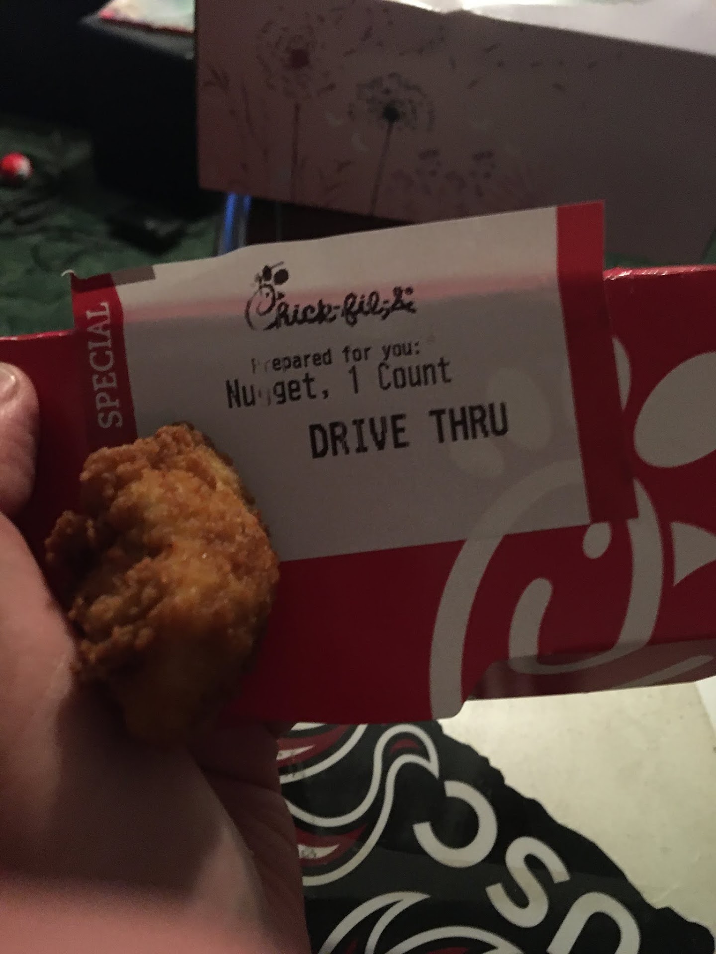 Ā Ā Ā Read moreThey'll let you buy a single chicken nugget here. For context, I am actually autistic and drive thrus stress me out. I roll up to the lady that takes my order and manage to fumble out that I'd like some sandwiches and an order of nuggets. She asks me what count of nuggets. I have not memorized the Normal Amounts of Nuggets, so I ask her what sizes they come in. She must not of heard me right and asks, "One count?" I assume this means a small, or a portion for one person. I am desperate to get through this simple interaction with my dignity intact and say sure. The lady repeats my order back to me, finishing with a "one count chicken nugget," as if that is a normal thing to order. I pay and move on. Another lady re-confirms my order - some sandwiches and a one count chicken nugget. Again, as if that is a normal thing to order. I say sure. I get to the window. They give me the food. I am proud of my ability to navigate basic social situations without crying and excitedly return to my family with the food. I find what you can see in the attached photo in the bag. Note that they took the time to specify "Nugget," not the default "Nuggets" of a normal order.