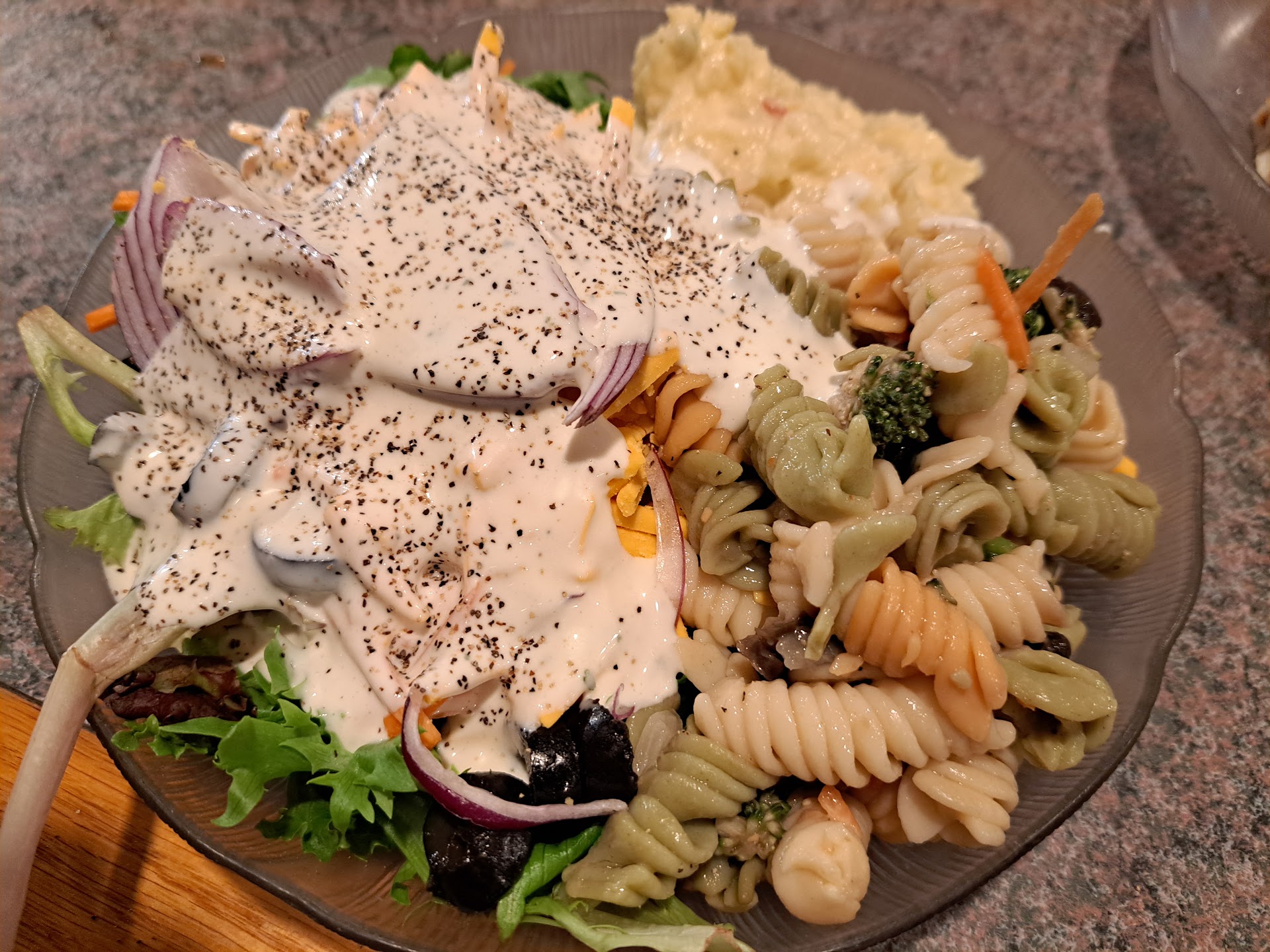 The pizza buffet was not setup and we were told it would be a few more minutes. We started with the salad bar, which was a pretty nice one, though the only green thing was iceberg lettuce. We finished our salad and waited on the pizza and our spaghetti, which is included in the buffet price. We did at least get our drinks refilled - yeap, we'd been there long enough to empty them.