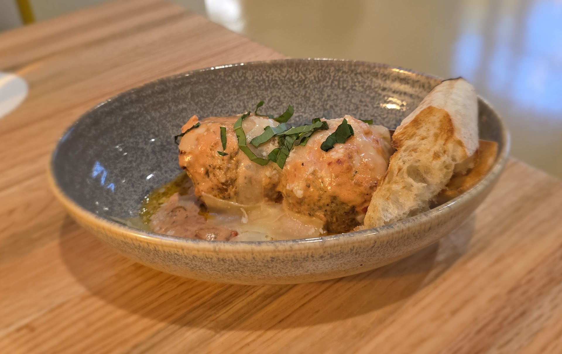 We started with the Meatballs. These come with two meatballs, tomato basil cream sauce & grilled ciabatta. The meatballs were good-sized, moist, and filling. They had a great mouth feel and chew while being light and delicate. The cream sauce is flavorful with a slight tomato pop, and the shaved Parmesan adds saltiness to the bite. The ciabatta bread was crunchy on the outside and chewy soft on the inside.