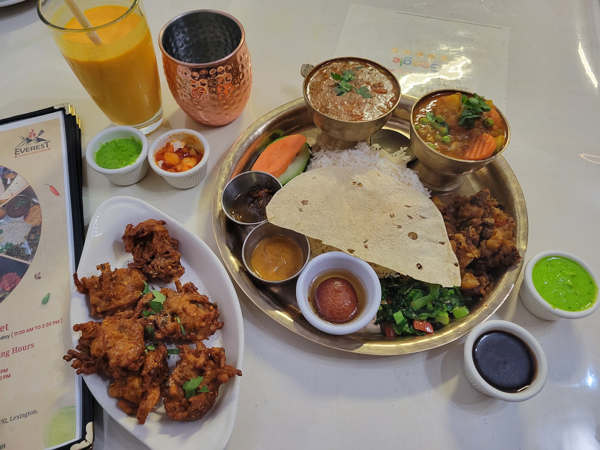 I'm visiting from Seattle for work, and found Everest via Happy Cow (an app that directs vegetarians and vegans to food, mostly while traveling in my experience), and saw that they had a huge vegetarian selection, including one of my Favorite things: Thalis!!