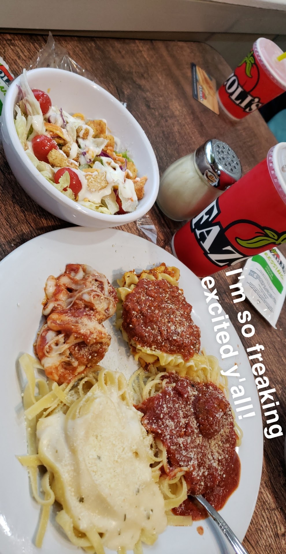The restaurant was near empty but the floor was filthy. Employees were literally on their phones in the front for us to see. The breadsticks they brought were hard and literally dripping garlic butter. I walked to the front to ask for fresh breadsticks, the cashier was on her cell phone and tried to walk behind the cups so I wouldn’t see her (she was the only one there to help me). When I just looked at her, she pulled her phone away from her ear just long enough to ask what I needed.