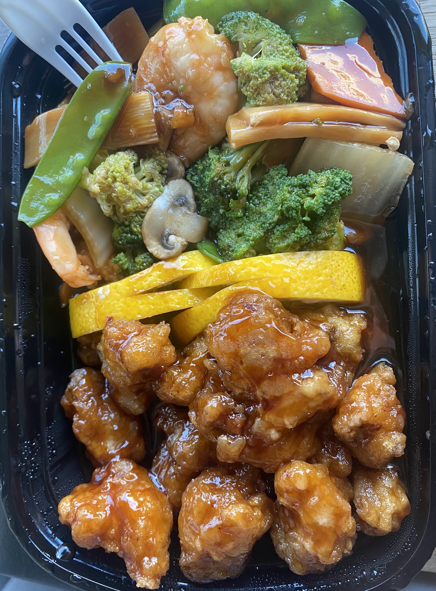 As far as my mom's food, her food was the same but the shrimp pea pod definitely could have been better. My sister said the shrimp had a foul "fishy" smell and there really is no other comments other than the shrimp was just bland and it's just very standard Chinese food. Other than that, at least it's edible but WAYY too expensive for the quality. We paid 32 dollars for that. Three stars, they're lucky to receive the ratings they do if I can say so without...