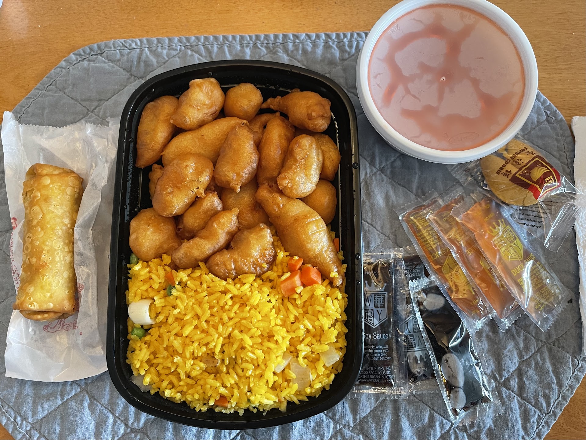 The eggs rolls was very strong, it had a pungent cabbage flavor and it was small and narrow in size compared to other egg rolls of other restaurants. It was also very dry (the wrap of the egg roll) but at least it was crispy enough to eat. As far as the other person saying that the sesame chicken needed more sauce, mine had plenty. I guess it depends of what type of day it is, but my sesame chicken had a little too much sauce and it was over soaked and soft. The chicken in the rice is white meat chicken chunks which is really all it is, nothing special. I could even prepare the same type of chicken by cutting up pieces of white meat from a chicken breast (I've cooked fried rice before, even stir fry). The rice was ok but I'd say this place was a step below China King, which says a lot because China King has kind of gotten sloppy and I quit going. At least they're yellow rice was very tasty, the pork and chicken was crispier and better in taste, BETTER egg rolls and sesame chicken is crispier and not too soft. China King even goes easy on the sauce if you request it.