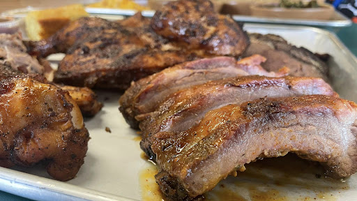 Counter service. Tiny place. Good reviews. Southern Pride rotisserie Smoker. Good machine.
