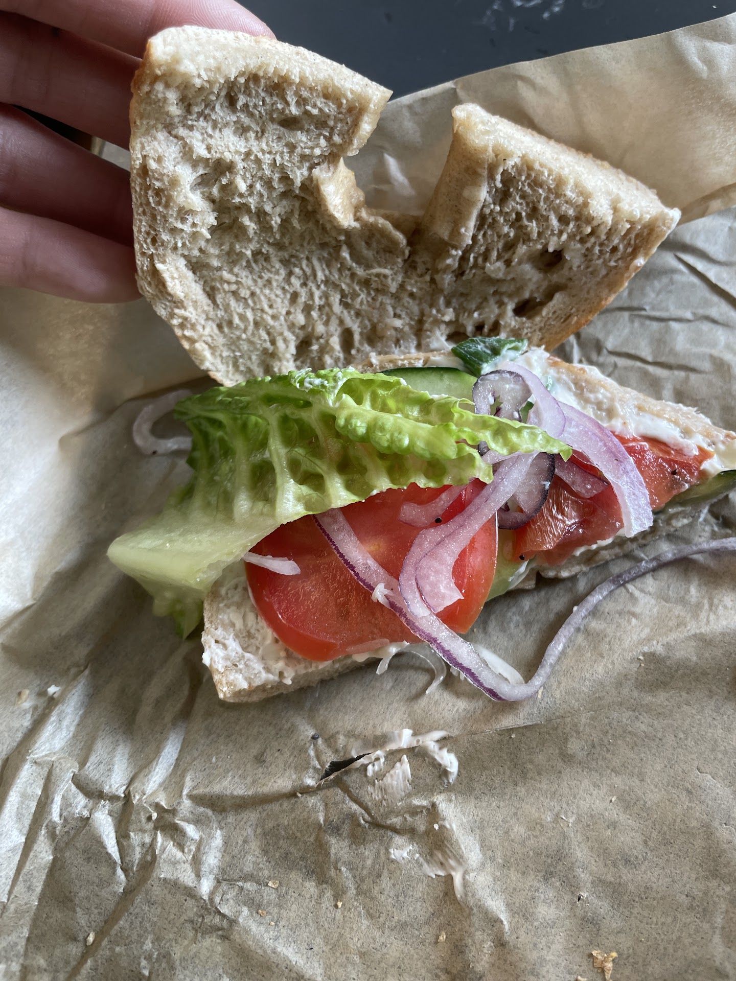 Read moreI rarely eat here cuz I'm cheap (habit from raising children) and it's out of the way, but I like the sandwich I usually get which is the BMB. It's only $7.60 which isn't breaking the bank, but the sandwich is on the medium to small side (like a normal sized bagel). It's thick because of all the stuff on it though. It's almost as tall as it is wide which makes it an unstable squat Jenga-like tower. So expect to either to: 1) stretch your mouth wide while pinching the bagel halves to get all the flavors in one bite risking the contents being squished out, or 2) nibble to try and keep it all together. My bet is no matter what you do, you're going to be losing bits and pieces to the wrapper or table. Here's why. The BMB is Vietnamese-style (Bahn Mi Bagel, I'm assuming) so there's a loose mix of veg and meat: spicy pork meatballs, pickled carrots and daikon, sriracha mayo, jalapeño and cilantro. This "slaw" is extremely hard to corral.You've been warned. Now, let's go back to economics. I usually buy an entree that my wife and I can share for this price (or a little more). This one you can't because of the size and it's so good you'll probably want to eat it all yourself. That's why I'll pay this on occasion for a special and...