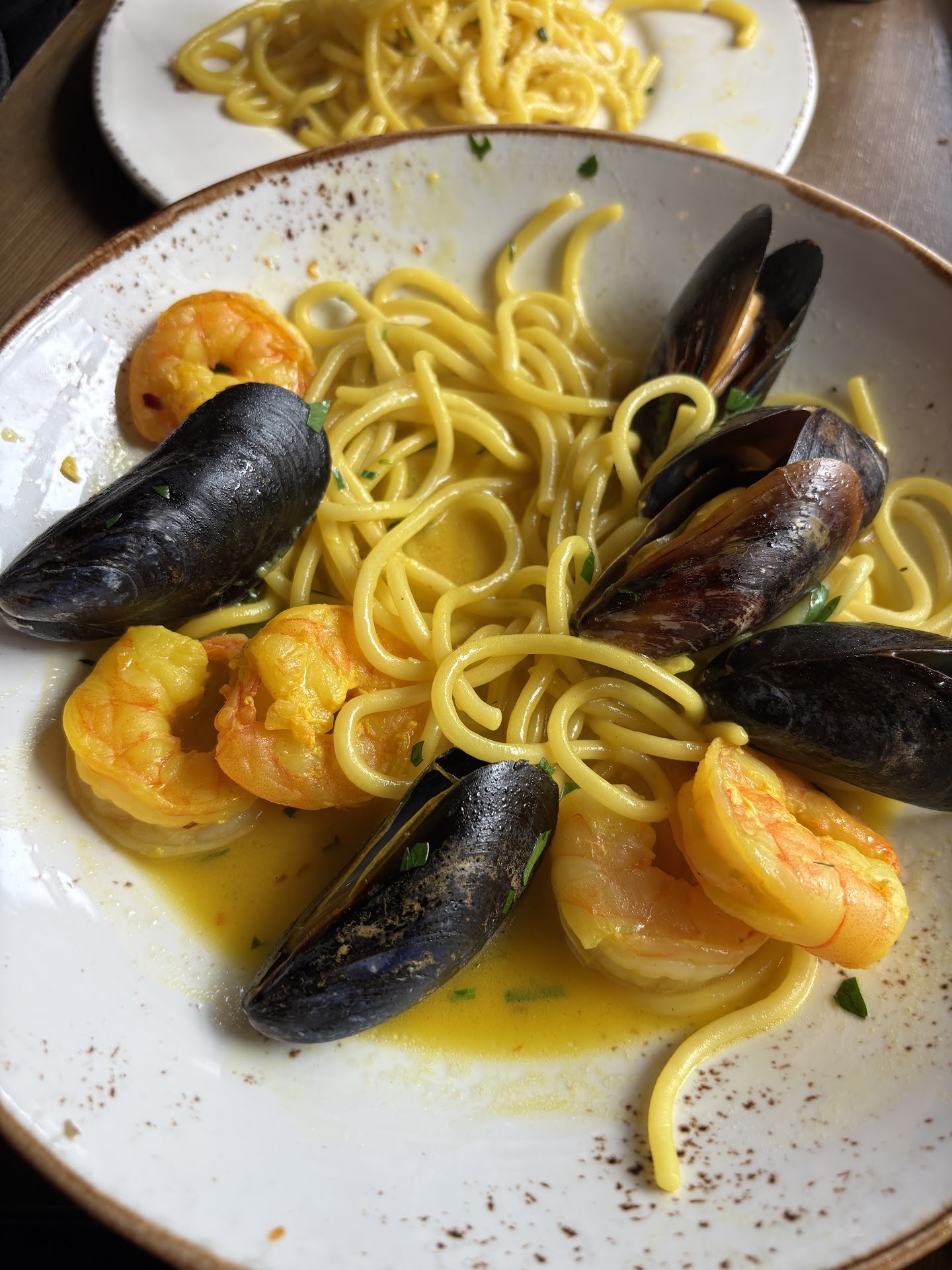 I ordered the Spaghetti ai Frutti di Marre. On the Instagram it looked like a brothy safron-y yellow sauce, though when I got it, it was a red tomato-based sauce. This was also one of the menu items on the online menu without an image. I think that Instagram picture was from 2022, so not super recent, but given the modern times we are in, I'd expect the restaurant to update their photos if a menu item changes.