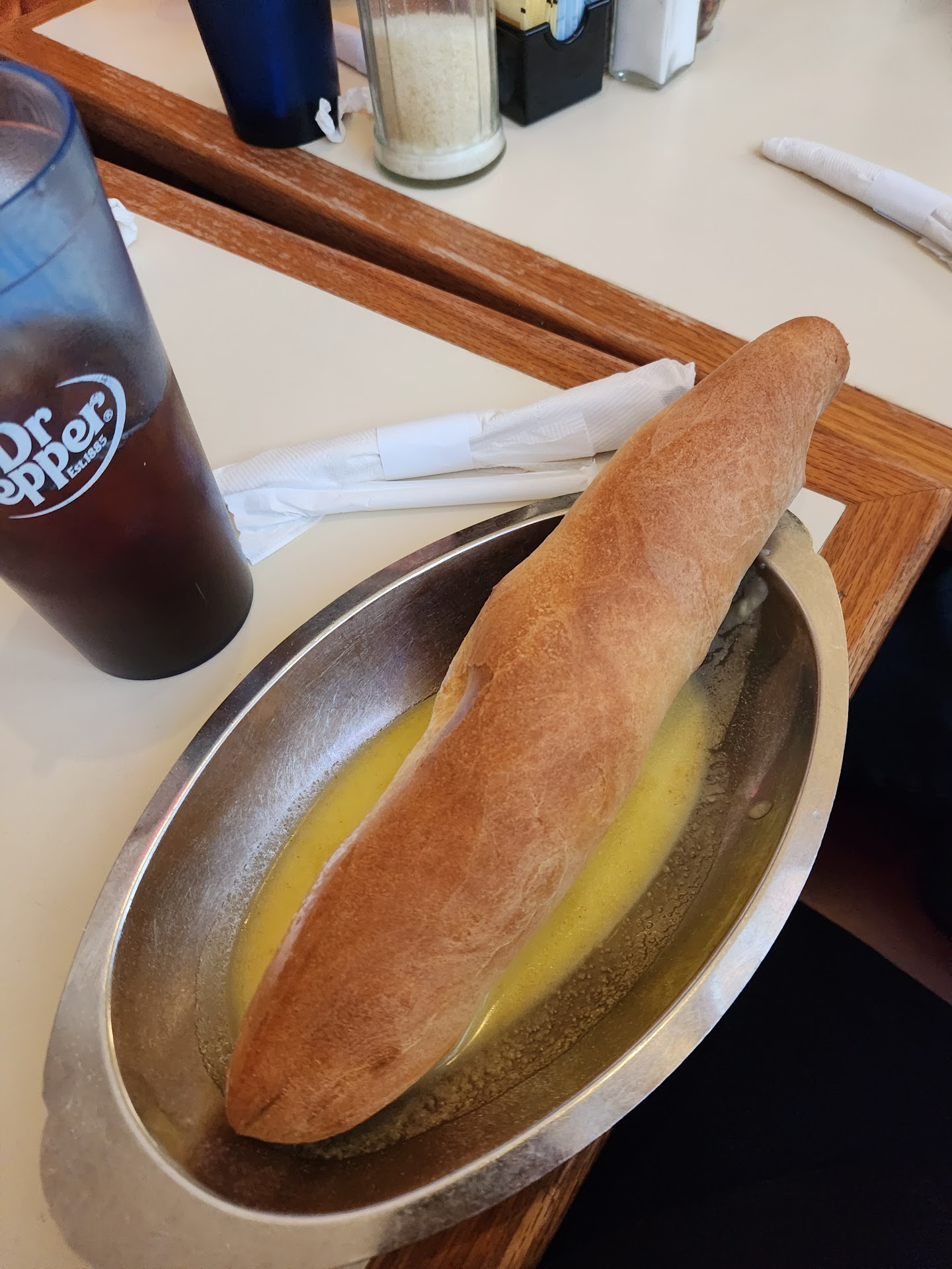 We also ordered the Lasagna, and it comes with a huge bread stick and one side(I chose soup). The lasagna is more rustic or casserole style than a traditional serving. This is made with beef and pork, ricotta cheese, spices, covered with marinara and topped with mozzarella cheese. This dish is wonderful, the noodles may have been overcooked so slightly and the ricotta makes the dish slightly salty, even though the sauce cuts through it. The bread stick is cooked well with a nice crunch and light and chewy inside. The bread is served in garlic butter. Our server gave us a pro-tip and said to add Parmesan cheese to the butter, and it is delightful.