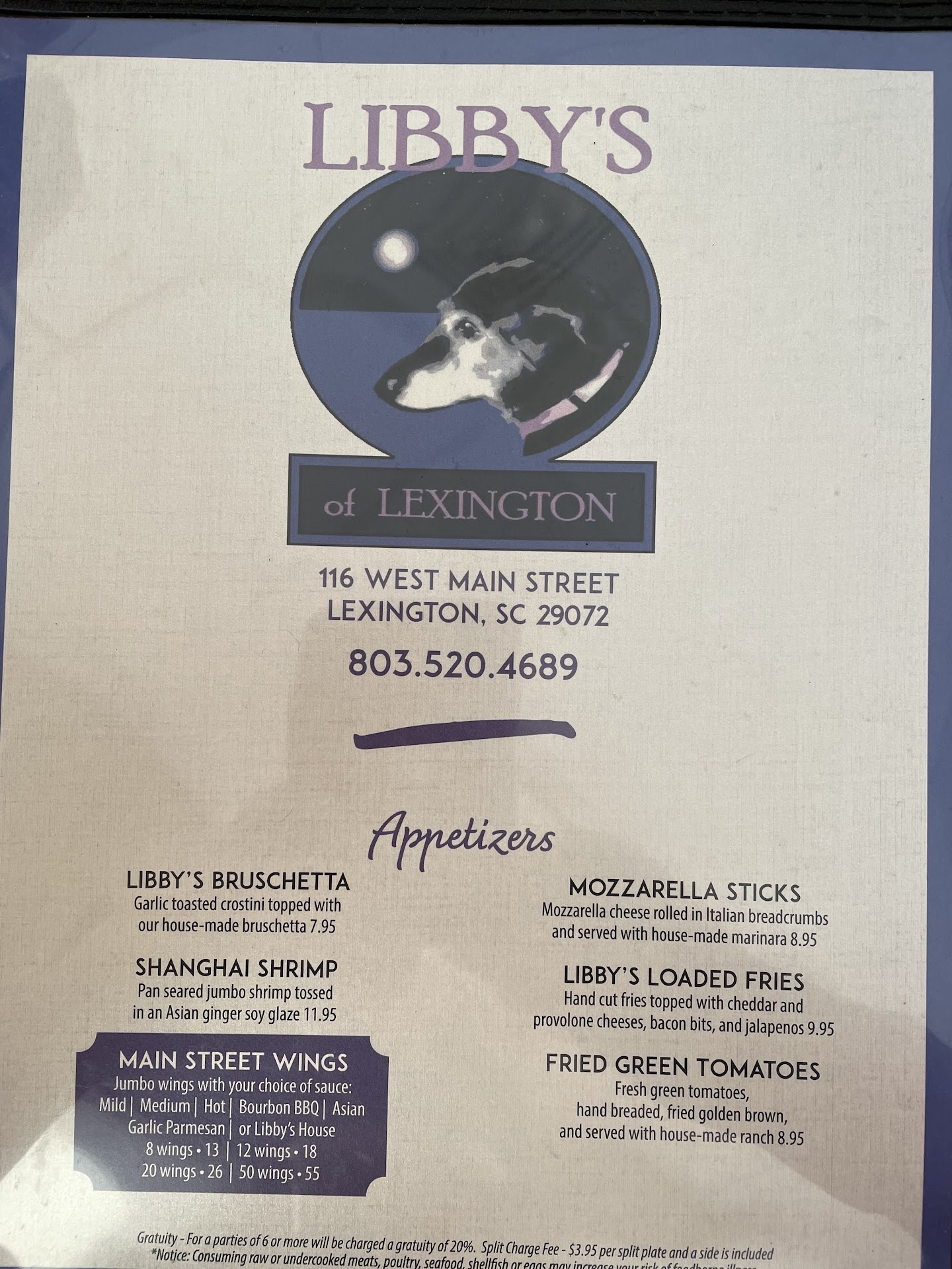 Read moreNever been to Libbyâs before. I was looking for somewhere to take my mom for her birthday and probably didnât do enough research. It was far more casual than I envisioned. The waitress was wearing shorts and the atmosphere left a good bit to be desired. The service was excellent & Iâd go back for that reason alone. First up was the fried green tomatoes and honestly they were the worst Iâve ever had; probably in my entire life. Zero salt or seasoning. Iâm a fried green tomato expert & these fell seriously short. Super thin, more breading than tomato and dull. I had the Folly Beach shrimp and asked the server if they were truly SC shrimp and she said they were. They tasted fresh and were probably frozen but I canât say I could tell if they were. They were lightly breaded, again no seasoning but perfectly cooked. Entrees are offered with only 4 choices of sides, hand cut fries , raw fries, pasta salad or slaw. Iâm not a fan of Mayo based slaw ( theirs is) so I chose the pasta salad & hand cut fries. The fries were good but under salted for sure. The pasta salad was decent, not overdressed. My definition of raw fries must be different from theirs as a dining companion got these and they were crispy like a chip. That same companion got the BBQ shrimp and said the sausage was almost inedible as it was suffering from being severely over cooked. It couldnât even be cut with a fork despite being paper thin. My spouse had the Libby burger and said it was good. Additionally the tomatoes were served with a dill ranch sauce made in house that was very good and the shrimp were served with a cocktail sauce that was horrible. It tasted just like ketchup with no hint of horseradish whatsoever. Huge miss on that. I left thinking Libbyâs has much room for improvement but overall was just ok. Truly the service was...