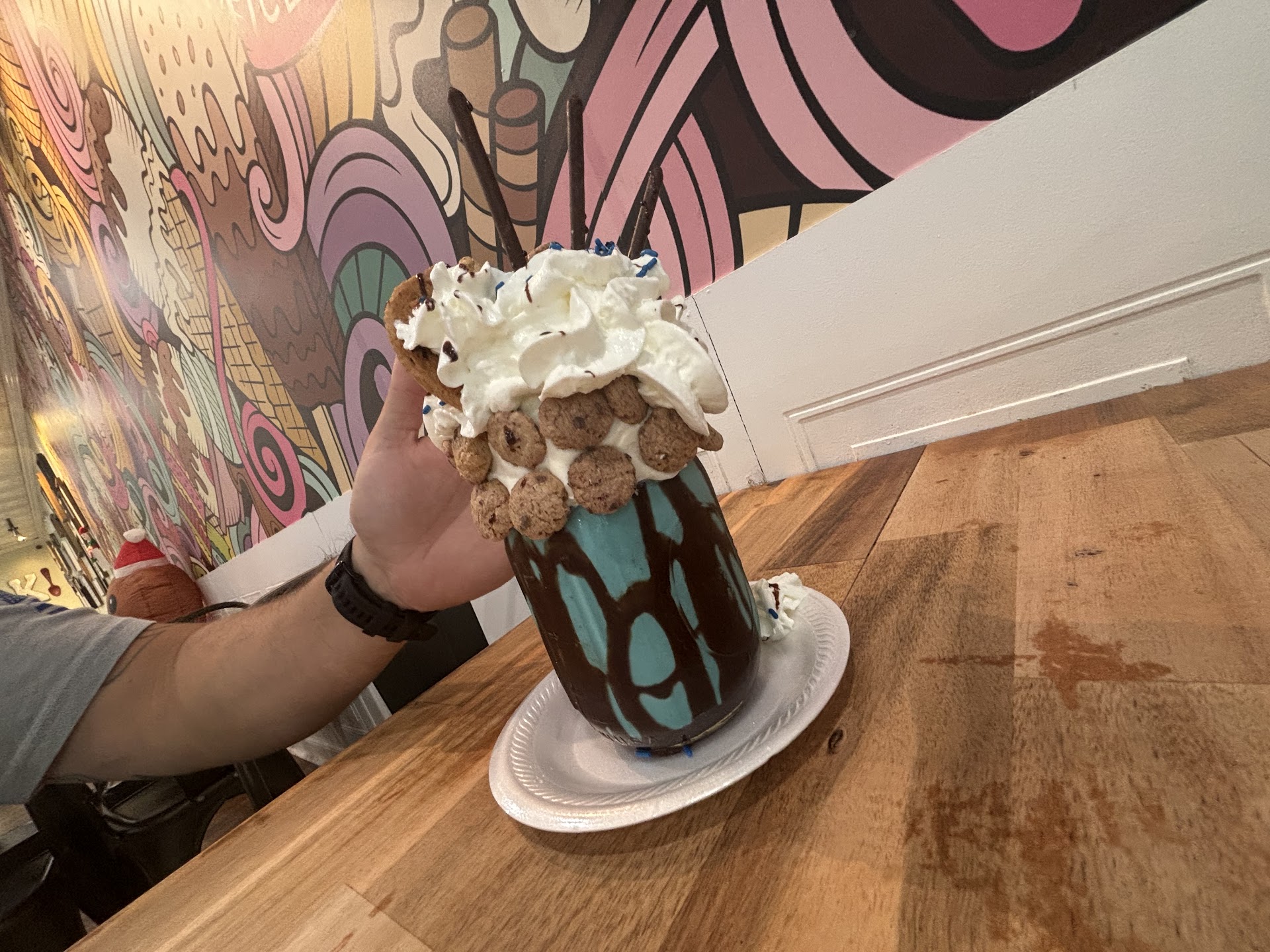 Letâs be real for a moment, a specialty milkshake place? First off the chocolate plain milkshake was probably the worst milkshake Iâve ever had. Way too much milk and I might as well have ordered a chocolate milk, for the size of the cup I watched him throw away at least a larger cup of the leftover from what he poured in my regular cup. The three specialty milkshakes were literally falling apart when they were handing them to us. (see cc tv as it fell all over the floor)They are WAY to sugary and donât make sense. They want you to keep this pint glass jar which is covered in frosting, cookies etc because âthey canât keep them and donât want themâ, what a waste. I paid over 50 dollars for three milkshakes and a chocolate milk that were not even half eaten, threw away three glass pint jars and watched as other people came in and just got ice cream (they must have known something I didnât prior to purchase). On a positive note there is a large selection of ice cream. No one behind the counter had a clue what malt was, because I asked for a chocolate malt (deer in the headlights), sorry should have put that before the positive comment. Either way I wonât return, not so much as it wasnât a horrible experience but the fact that the prices are that high, the pint jars are wasted and the quality of what Iâm getting isnât congruent to the amount Iâm paying. I take that back, if I was driving by and thought I wanted a scoop of ice cream, nope take that back, overpriced for a small scoop at that price, I saw what other people...
