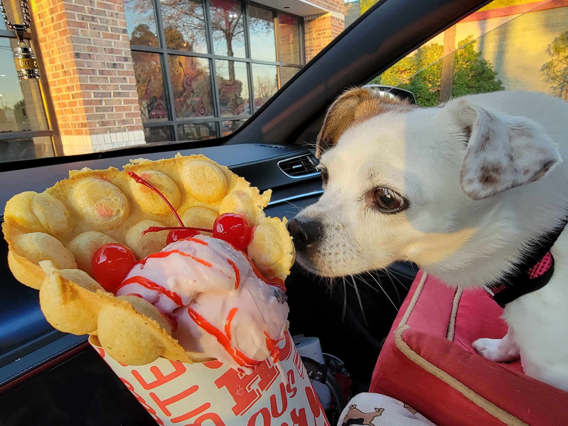 Read more5 stars for customer service and ice cream selection. The young lady who helped me was very nice and polite. I got the black cherry ice cream, my favorite!!, in a bubble waffle. The ice cream was delicious! Both my pups loved it. The bubble waffle was OK. It was freshly made, but it needs to be a little sweeyer and fluffier. Inside of the bubbles was filled with dough, which made it more dense. If they use less mixture and create an air bubble, it would taste better... and adding a little more sugar, it would be perfect. I was disappointed that they don't do tasting. The banana foster sounded good, but it's not a common flavor. I decided to go with just the black cherry since 1 scoop was a lot already. I was going to get both. They have a lot of flavor options. Many are very colorful. I prefee the more traditional flavors; Plus, I share my ice cream with my dogs, and I alqays get somerhung that is fruity or vanilla based without chocolate. I didn't want to try the fancy Mason glass ice cream with a dessert on top, but it is just too much for me and my girls, and my body can't take the amount of calories. The Mason jars are a meal!! Lol. I would come back here again if I'm in the area. I plan on stopping by their other location before...