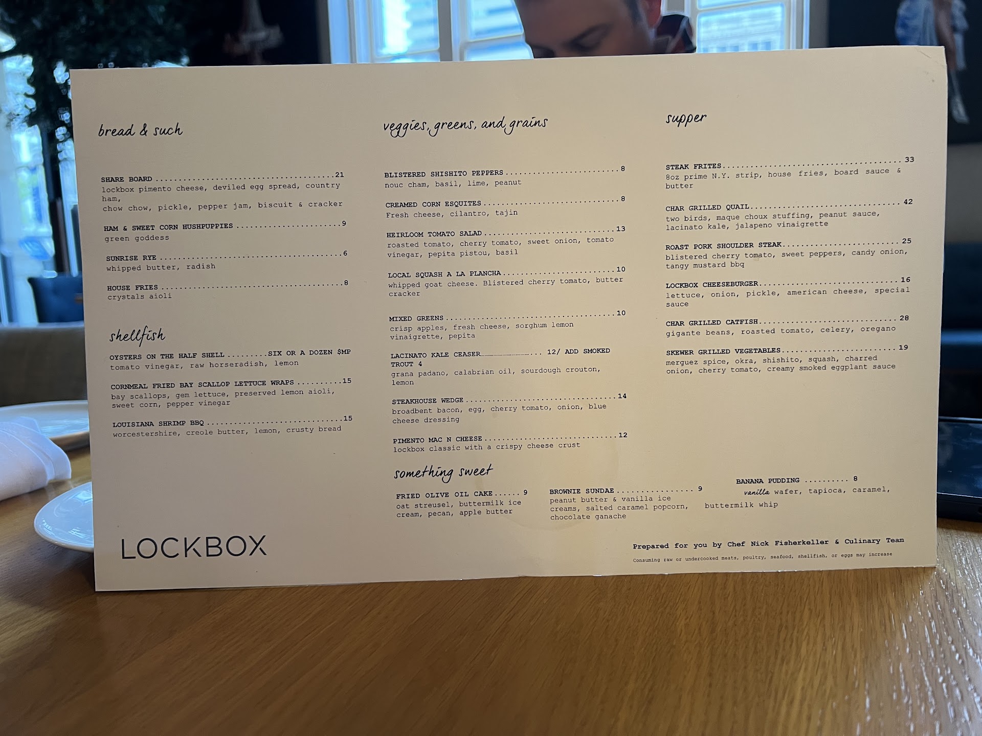 Read moreImpressions of Lockbox is moderately fair. The menu has Kentucky inspired flavor with the cheapest dinner plate being 15 and the most expensive being 30. With an average of 24 dollars.