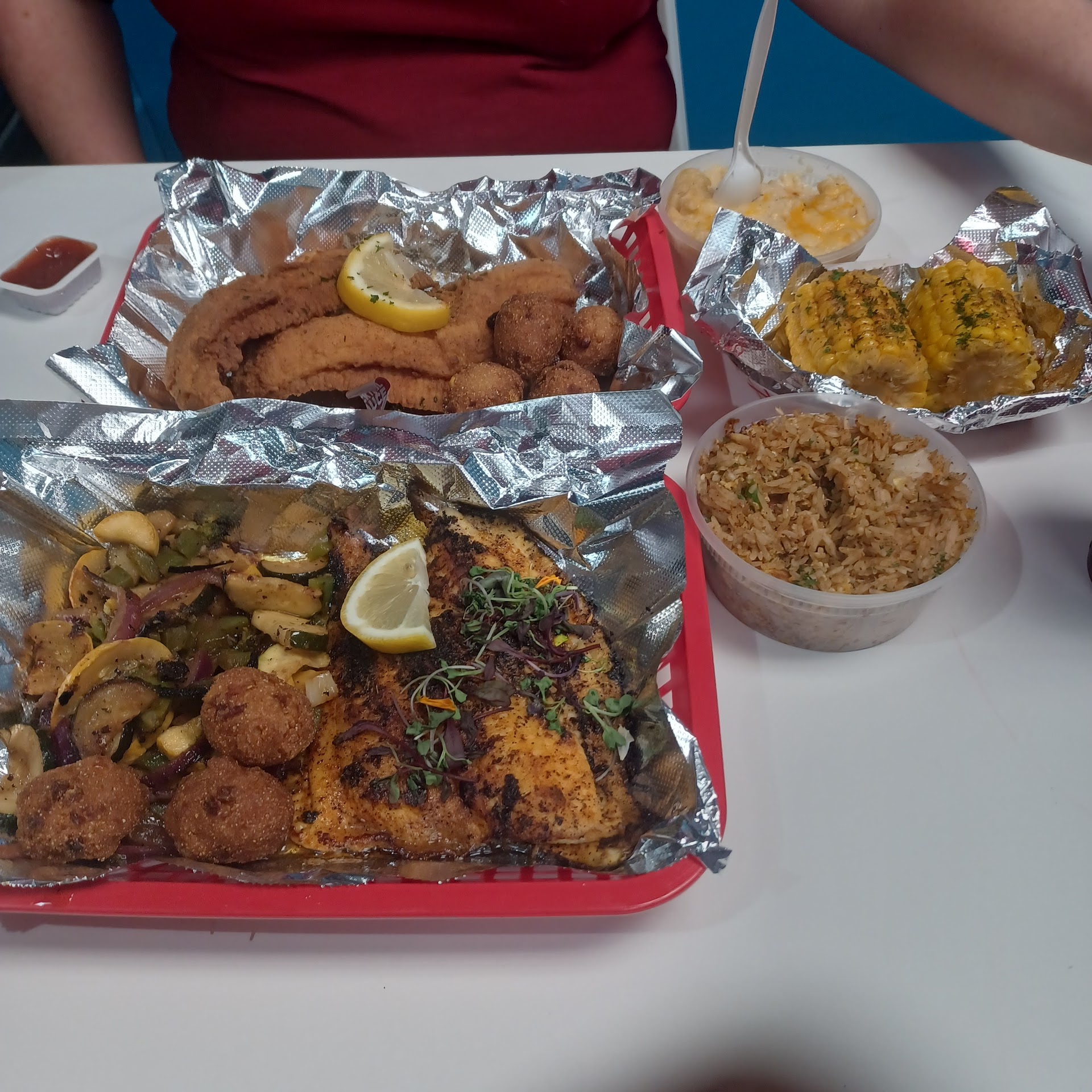 Read moreAMAZING food and service. You did the dang thing! First thing on my plate I tasted was the cheese grits, my eyes lit up & I immediately knew those were grits made with love & that i was about to eat good. I want to try everything on the menu. Love the corn pieces in the hush puppies, the clarified butter with spices on your corn on the cob, seasonings on the fish..then the sautéed broccoli/squash/zucchini I literally had to order more of that to take home with me. I wish you had collards on the menu cause I already know you probably make killer greens. Hard to find good quality restaurants anymore and I'm glad we found your place..haven't been wowed by a restaurant in a while! Really took me by surprise tonight. My mood was boosted after eating here, left...