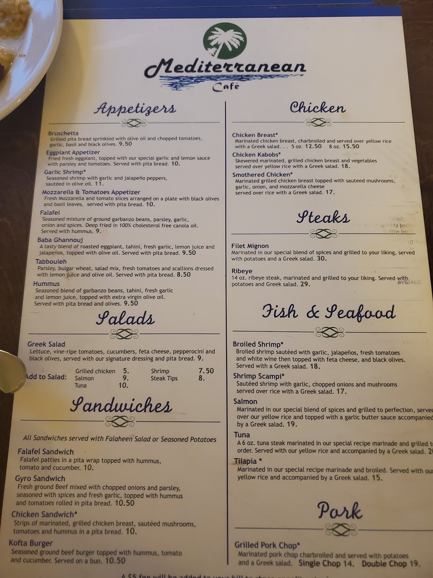 Read moreThe food and service are great! Visited The Med again tonight - 6/2/23. They were BUSY! The food and service were still great! I have 8 to 10 favorites on the menu. Tonight was the ribeye special. Wow! When craving steak, I've been ordering the filet because it is sooo good. But geez, the ribeye deserves respect along with the salmon, tuna, lamb chops, and, last but not least, the broiled shrimp. The broiled shrimp is a dish you may not find anywhere else in the Columbia/Lexington area. I love it!! The aforementioned ribeye special came with mashed potatoes and collards, mmm. Anyway, when I leave The Med, I'm never hungry and usually thinking about what I'll order on the next visit. The staff members are very...