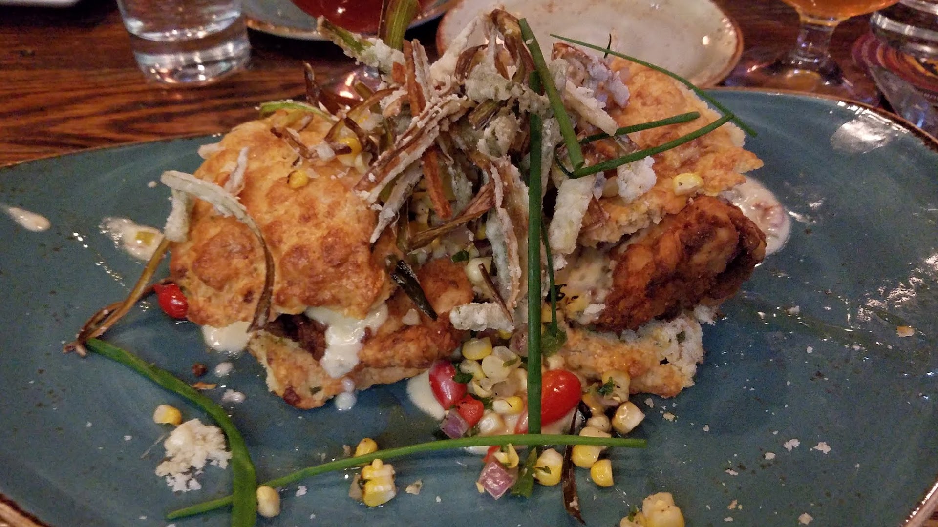 The food was phenomenal and is the best reason to visit OBC. We started with the bacon in a glass. This dish sounds--and looks--a bit quirky, but everyone at our table who tried it was pleased. The bacon was very thick cut and was more meaty and less fatty than more typical cuts of bacon. It is served with a peanut butter dipping sauce which also sounds unusual but we found that tasting is believing. It was very good, but also very filling--one strip is a great appetizer; two strips would be excessive (for me at least). I ordered the Chicken and Biscuits and also got the Buttermilk-Jalapeño Skillet Cornbread to share with the table. The chicken and biscuits were amazing. The boneless fried chicken had the perfect ratio of meat to crispy breading and was a savory delight. The buttery biscuits it was served on were flaky and delicious. As with the bacon, the serving size was ample and I was only able to eat one of the two portions. Surprisingly, the buttermilk-jalapeño skillet cornbread was possibly my favorite dish of the evening. I've had similar dishes elsewhere--or so I thought--but this was a real delight. It was savory and moist with an interesting mix of sweet and spicy. I'll definitely order it again if I return.