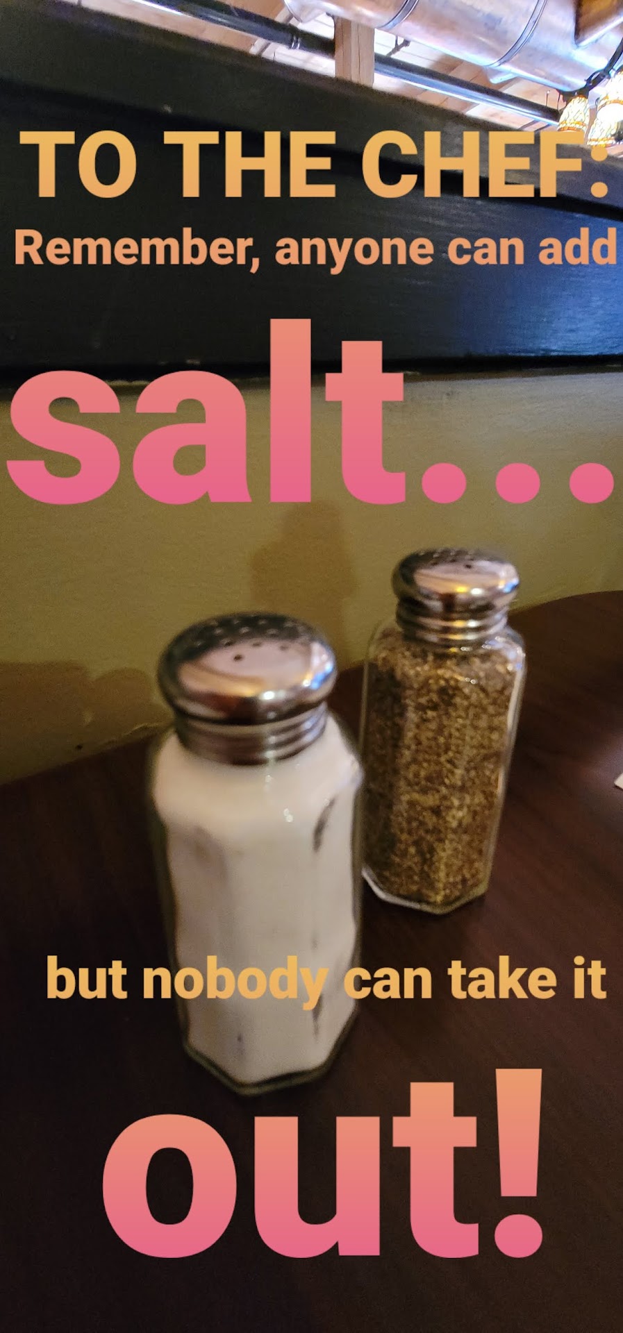 If someone wants to ADD salt, there is some on the table. But what can you do when the chef put in too much? You can't un-add it! Too much salt is a serious heart rhythm concern for some of us, besides being unpalatable. By the time we got home, my legs were blown up from fluid retention and I had to take some extra medicine that evening.