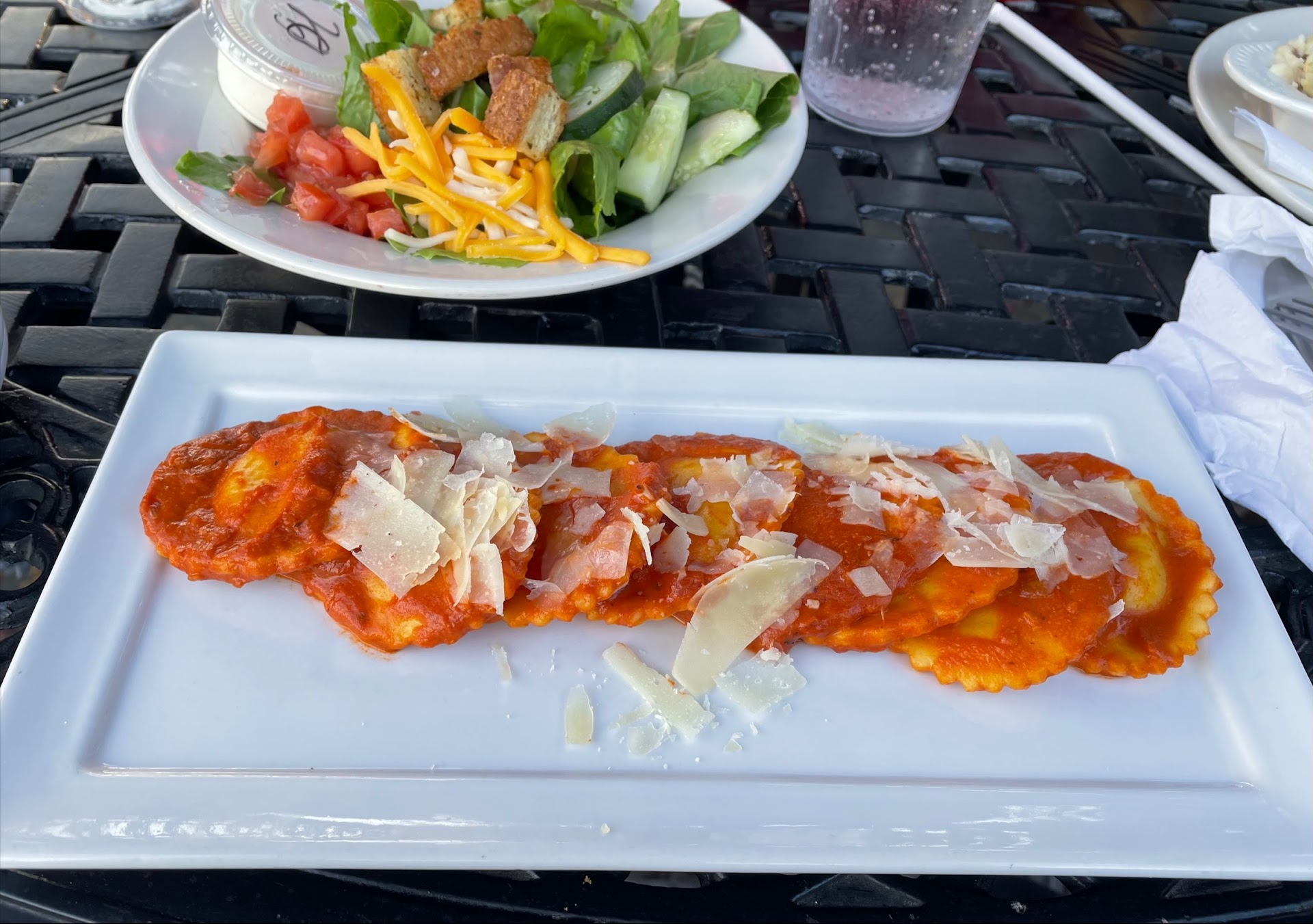 We found out after being seated about 2:15 PM that the full menu is not served until 3 PM! We decided to wait the 45 minutes, and ordered appetizers: fried green tomatoes, and pretzels with crab dip. I expected the pretzels to be salty, and they were - - but the saltiness of the dip was a surprise. I couldn't finish either. We couldn't eat the fried green tomatoes. They were not completely done. Parts of the batter were still uncooked. The waitress was properly apologetic and removed them from the bill. We have a thing about onion rings, so we ordered some onion straws, with the intent on sampling and taking them home. Physically, they looked maybe one step away from the onions you buy in a bag for green bean casserole. They were also too salty, so we left them.