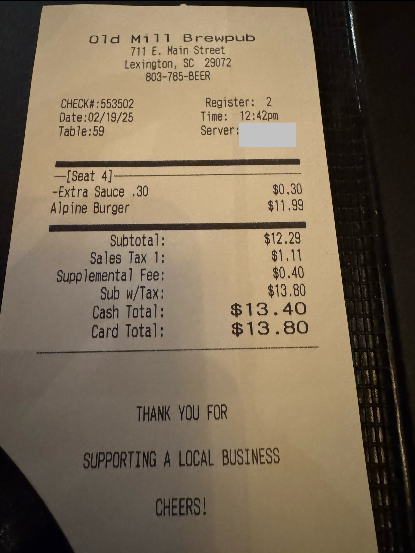 I ordered the Alpine burger which was essentially a mushroom Swiss burger. When the food was brought out, the burger was just the patty, cheese, mushrooms, and bun. When the waitress stated she’d be back with ketchup for my fries, I asked for some mustard as well for the burger. She brought it out in a 2oz condiment cup full and I used about a tsp worth on my burger. Then the check came and there was a $0.30 charge for “extra sauce”. When I inquired about that with the waitress, she informed me that “anytime we have to get something from the kitchen there’s a charge.” I said I realize this is only 30 cents but I have never in my life been charged for mustard on a burger. She grabbed the manager who was rather defensive about the situation. Below is the conversation:
