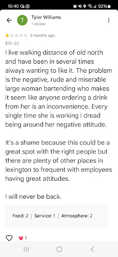 Read moreQuality food can only carry a bar/restaurant so far. Service with a negative attitude will always bring down the experience for myself. Multiple times, on multiple visits, my wife has ordered drinks with friends and received unnecessary attitude from the bartender they encounter. Every conversation our group has had with this server has been negative. My sober wife went to order a Non-alcoholic beverage last night, and was lectured about how there is still alcohol in NA beverages. The bartender required ID to be shown, which is fine, my wife is 29 and already had it out - but there's no reason to share your useless information when we all know its only because they assumed my wife's age. This experience was the third and final straw and we won't be visiting again, at least until the rudest bartender we've encountered in town finds their next...