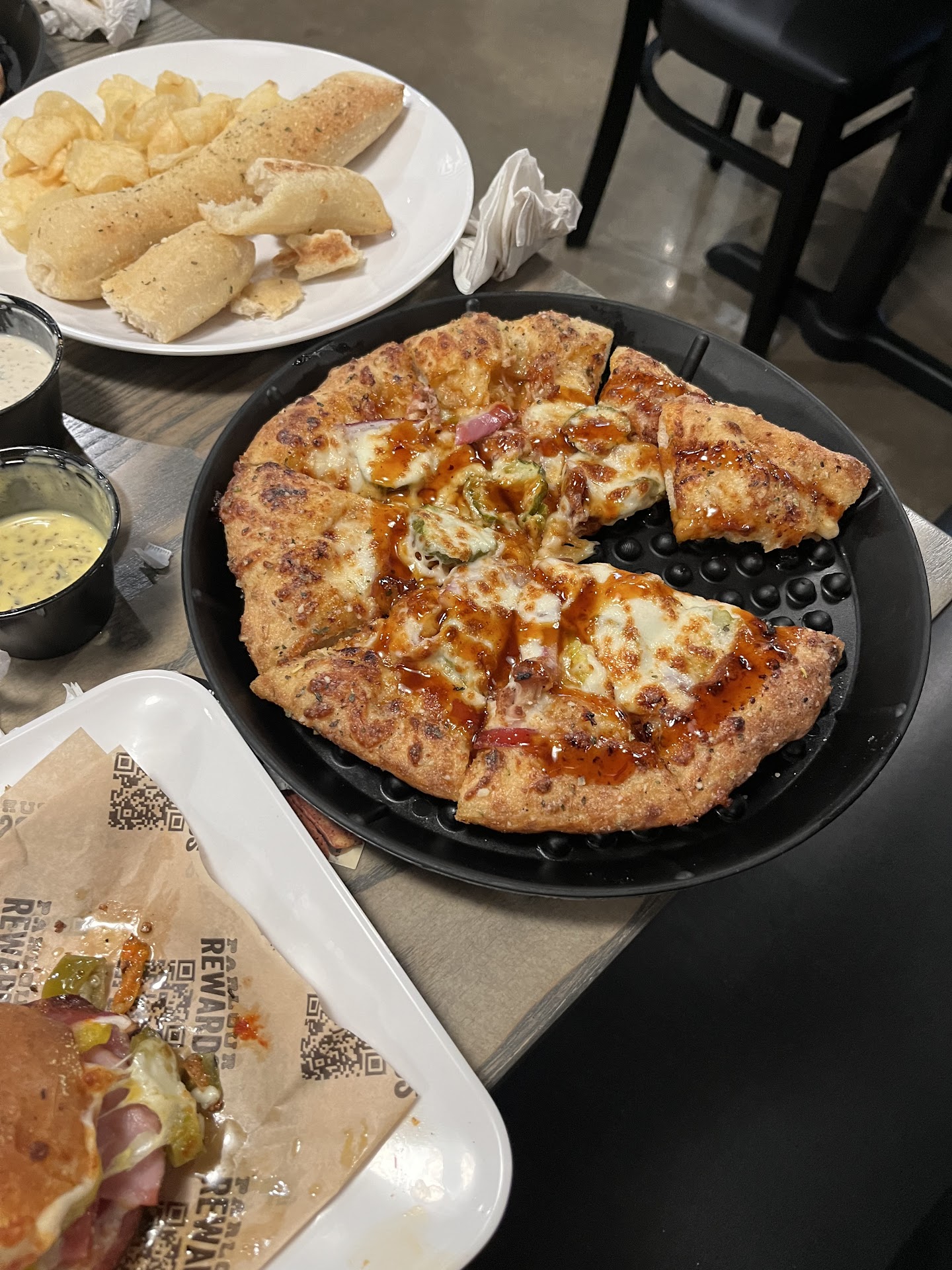Next is taste, being 100% frank here. I did not like the bbq pork pizza. It was almost like a burnt tasting pork with the pickles being one of the oddest combinations of tastes on a pizza i have ever had. The Hawaiian pizza was not much better. It was canned pineapple which isnât the bad part. depending on the brand they use it had a tin can taste that ruined it for us. The garlic breadsticks were decent. They tasted fresh but did not have the garlic taste i was looking for. I would argue that Little Caesars has a better GARLIC bread stick. But overall they are good. The subs⌠both of the subs i order with one being labeled as âvery spicyâ (the boss) Had an overwhelming sweet taste that i have come to believe is in the bread. I believe this because that was the only similarity between the chicken bacon ranch and the boss sub. It was so sweet it over-powered the spicy boss sandwich. And every bite i took was like a sugar packet. I couldnât even taste the jalapeĂąos on the sub. Now i cannot really base my grade on the subs and bread sticks because the flaws i found may be your type of thing. I will however judge it on the pizza because we can all agree burnt and tin can taste isnât exactly desirable. So its for these reasons i have to give it a star down. Thats two stars downâď¸âŹď¸.